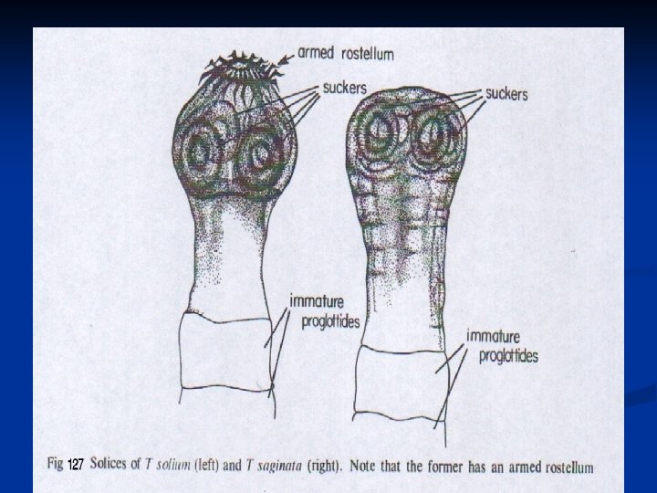 Morphology: v T. solium resembles to T. saginata, but it is shorter. v It length less than 3 meters ( because the number of proglottids fewer than 1000 & has smaller gravid proglottids). v Armed tapeworm of man. v It has a globular scolex with four suckers and rostellum with a double circle of alternating large and small hooks, that gives it a solar appearance. v There is a neck and it has a long flat body.