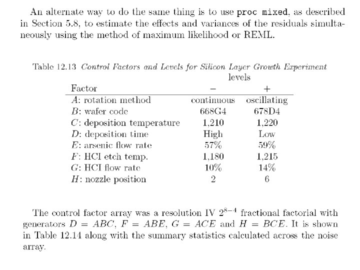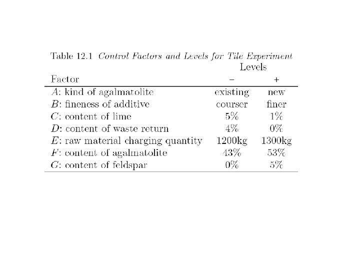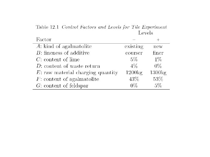 Simulated Noise factor H represents position in the kiln - = in the center, + = near kiln walls where temperature is higher Total of 27 -4 = 8× 21 = 16 measurements