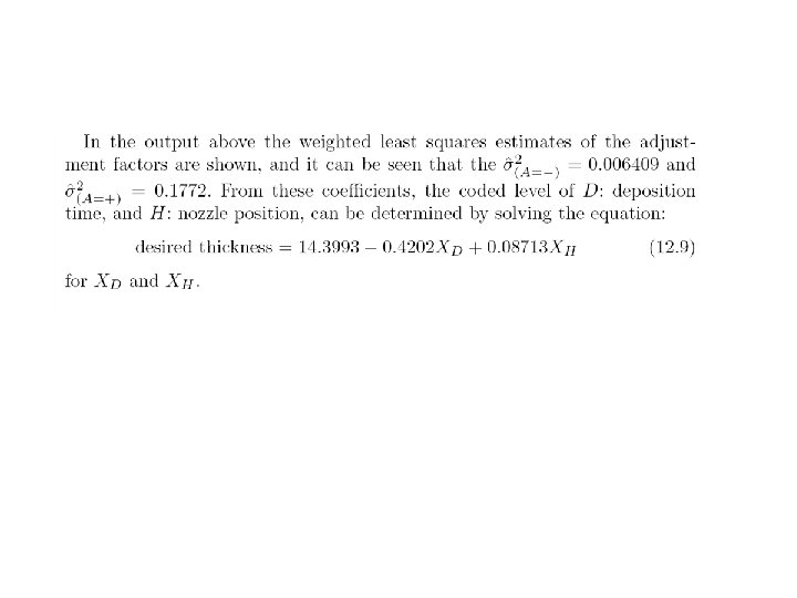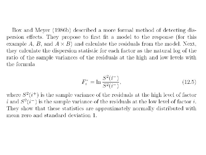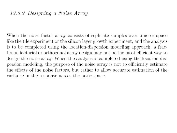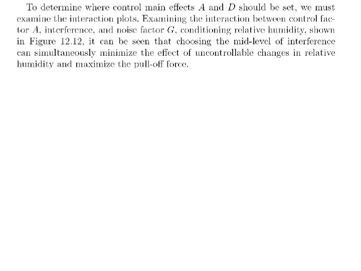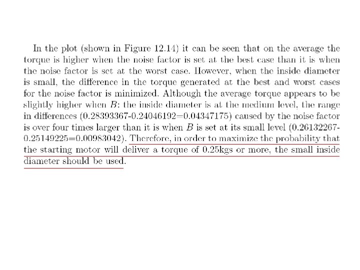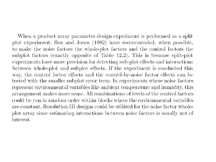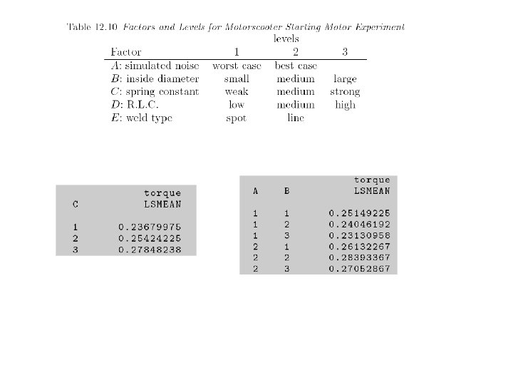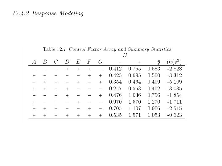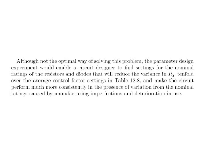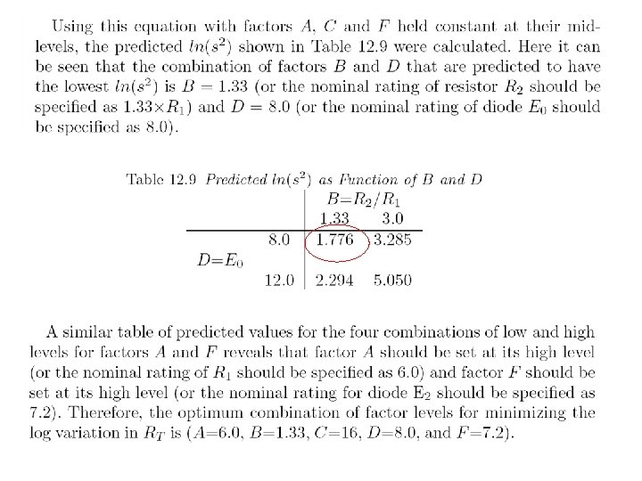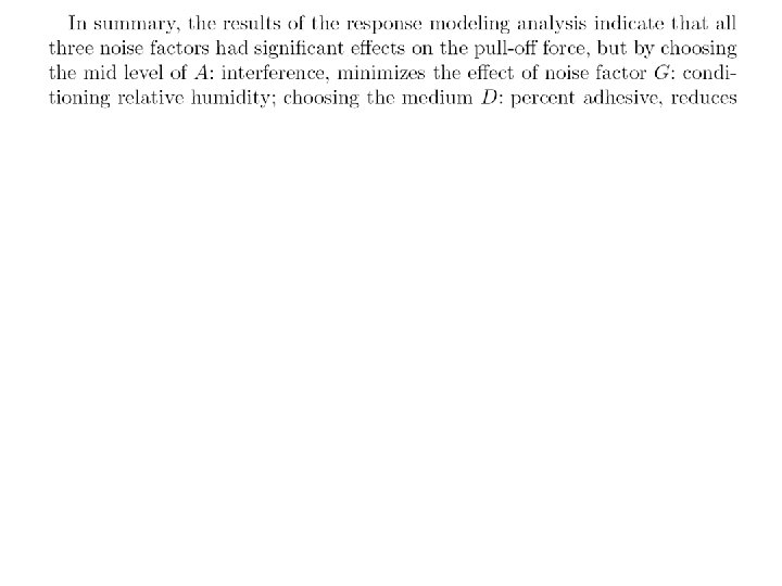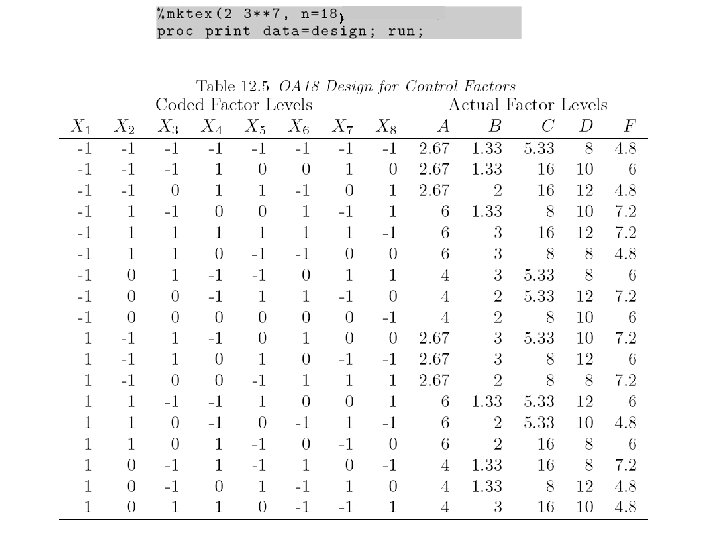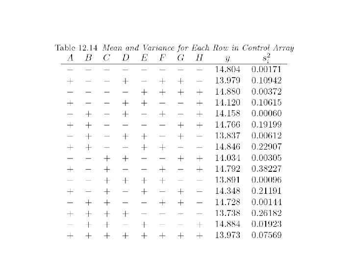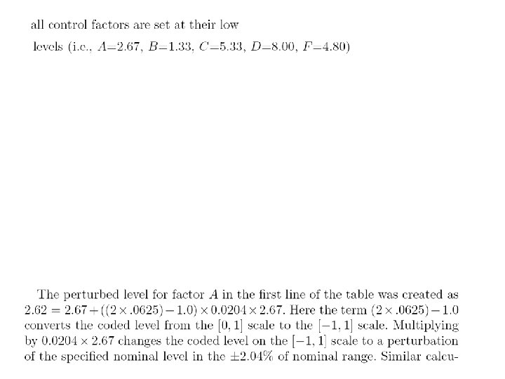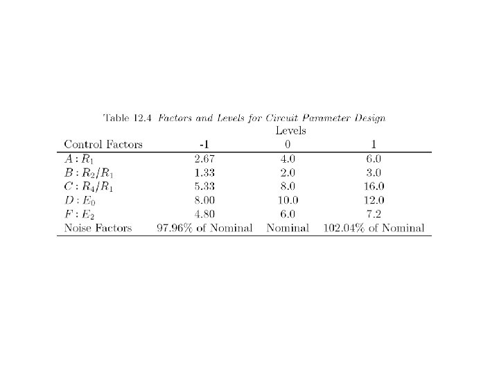 Levels for noise factors ± 2. 04% of nominal setting Example: when control factor A is 2. 67 low level of noise factor A is (1. 0 -0. 0204)× 2. 67=2. 62 high level of noise factor A is (1. 0+0. 0204) )× 2. 67=2. 72