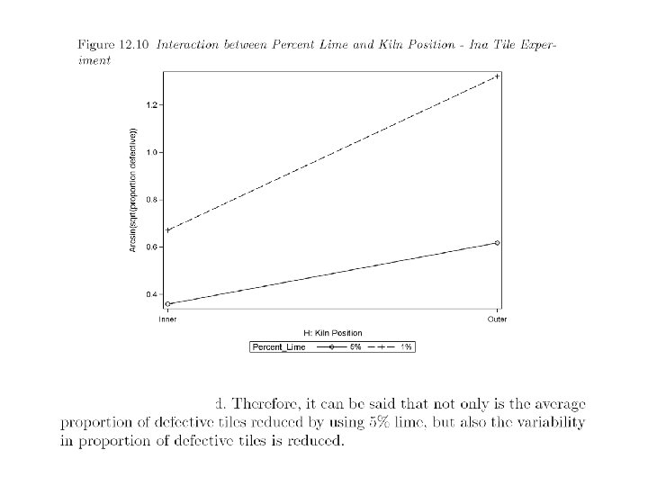 Conclusion: increasing the content of lime from 1% to 5% reduces the average percentage of defective tiles, and reduces the variability in percentage of defective tiles caused by the temperature gradient in the kiln.
