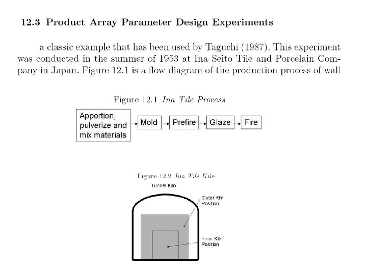 Single Array Experiment to Improve an Injection Molding Process Excessive part shrinkage was causing assembly problems Control Factors (could be easily varied): A: mold temperature B: screw speed C: holding time D: gate size Noise Factors (normally difficult to control): E: cycle time F: moisture content G: holding pressure