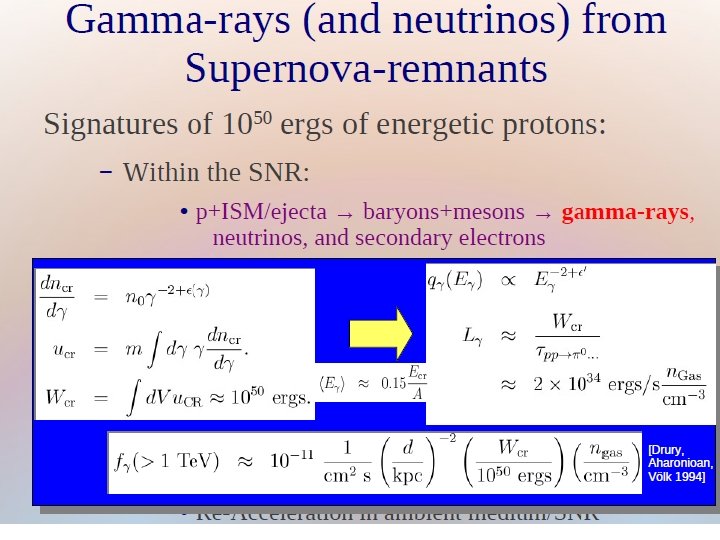 Derivation of DAV formula : Ƭpp = 1/ ( ngas · c · k - inelasticity σpp) = 6 x 107 ( n gas / 1 cm-3) год, P (E) = I x E-2 total energy = integral from 1 Ge. V to 1 Pe. V I x ln( 10^6) = 1050 erg I = 7 x 10^48 erg c (P -γ) = 0. 1 - part of proton energy transfered to gamma-ray Fγ (Eγ ) E ^2 = I x c (P -γ) / (Ƭpp ( 4π d^2) ) = 10^(-11) ( Wcr/ 10^50 erg) ( ( d/ 1 kpc)^-2 erg / cm 2 s n gas / 1 cm-3 )