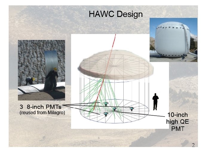 HAWC Site Location in Mexico • 4100 m (13, 500’) above sea level • Latitude of 19 deg N • Temperate Climate • Existing Infrastructure HAWC Large Millimeter Telescope (50 m dia. dish) Pico de Orizaba 5600 m (18, 500’)