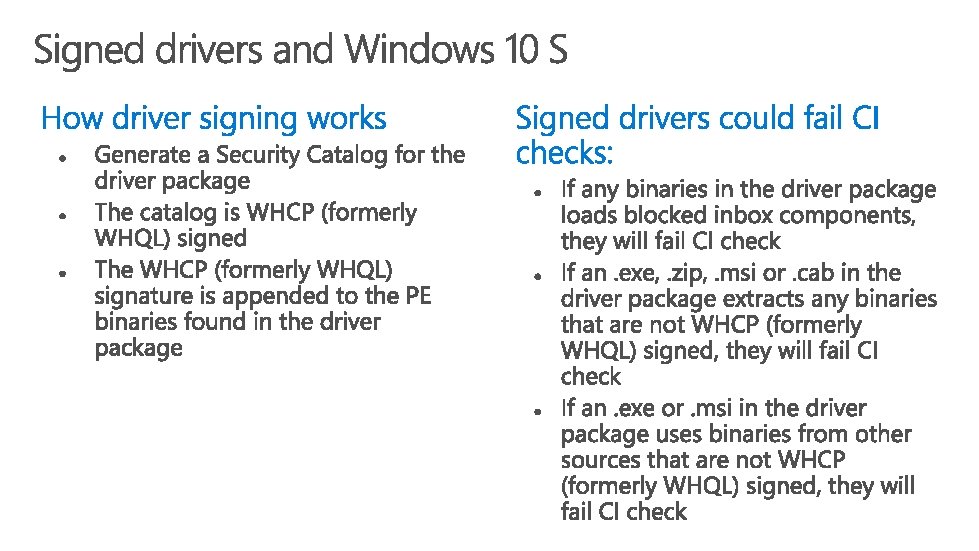 • At this time, the Windows 10 Hardware Compatibility Program does not have a program for Windows 10 S Use the latest Windows 10 HLK to validate compatibility • The plan is to have a test in a future release of the HLK that would help partners validate compliance with Windows 10 S Driver submission process will have checks on driver compliance