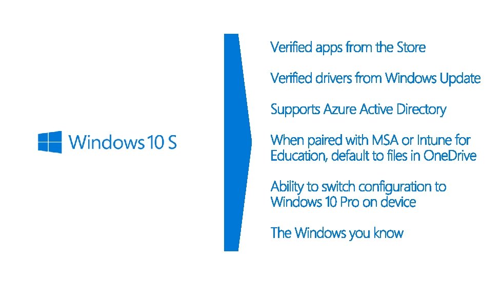 Configuration & Features Windows 10 S Non-Store applications Home Pro ● ● Domain Join on premise Azure AD domain join ● Windows Store Apps (incl. Win 32 Centennial Apps) ● ● ● One. Drive setup and sync automatically (req MSA) ● Configurable Microsoft default apps set for default files ● ● ● ● Configurable Windows Update for Business Windows Store for Business Mobile Device Management (MDM) Bitlocker Enterprise state roaming with Azure AD Shared PC Configuration Other Limited ● ● ● Windows 10 S Home Pro Edge/IE search default: Bing and designated regional search providers) ● Configurable Switch to Win 10 Pro (through Windows Store) ● ● *not exhaustive, illustrative to outline configuration differences Windows 10 S Configuration • The Windows you know • The best of the cloud and full featured apps • Designed for Modern devices • Users can switch to Windows 10 Pro
