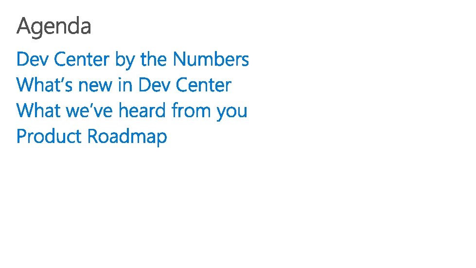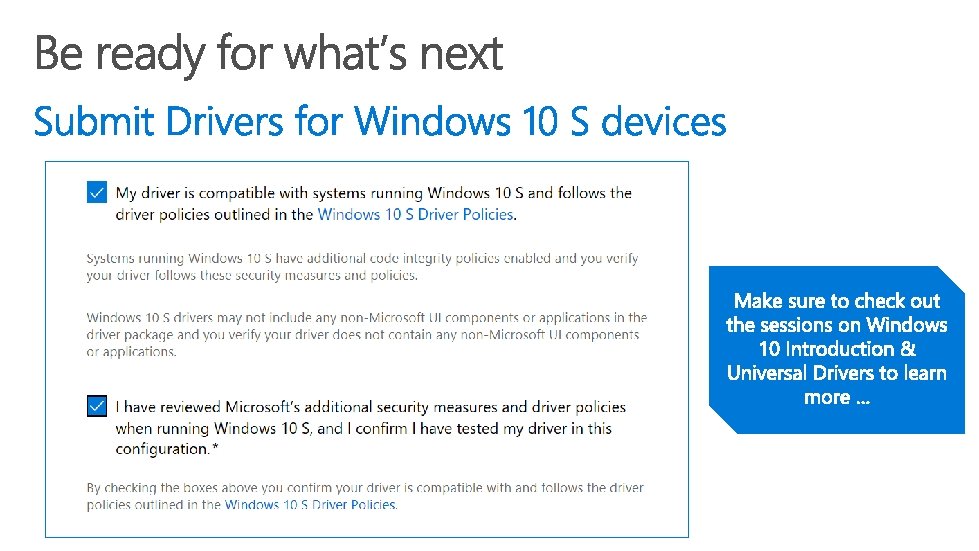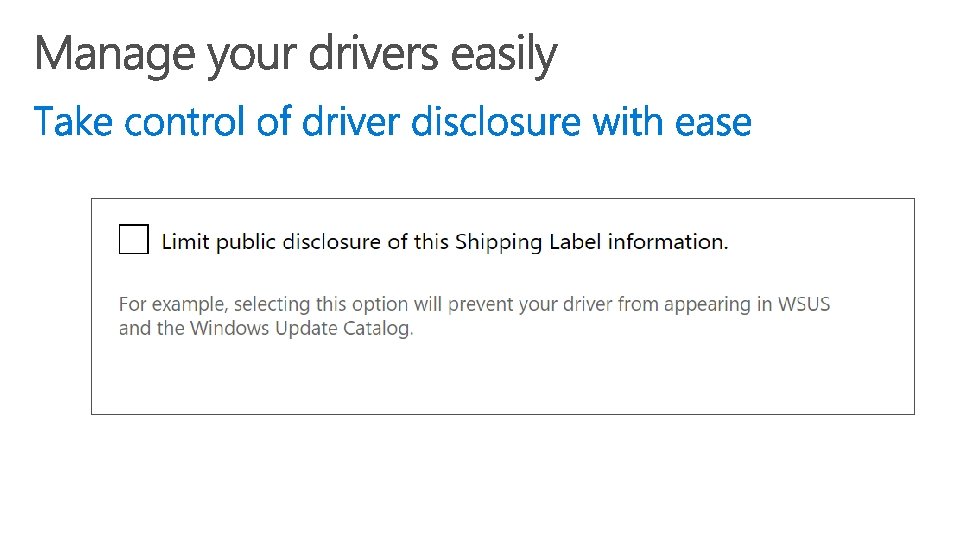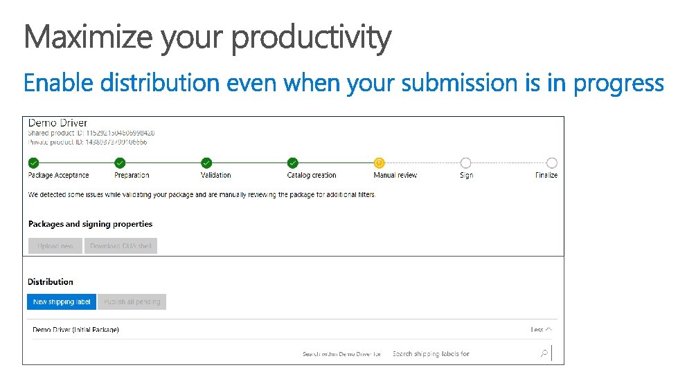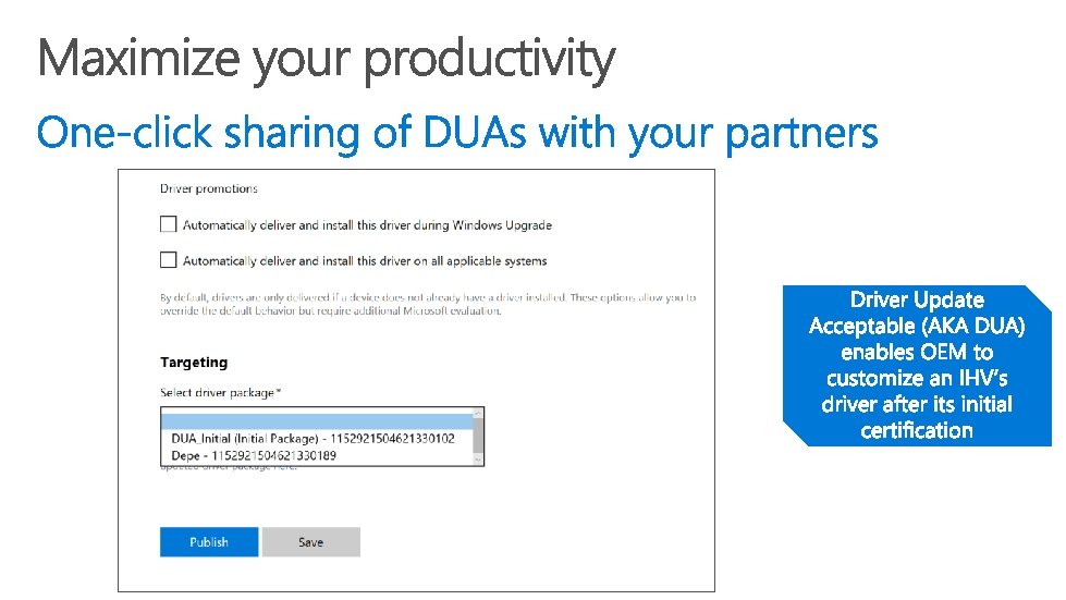 Phase 1 • Enumerate Submissions • Enumerate Shipping Labels • Submit New Driver/System • Download Signed binaries • Publish Shipping Label (full targeting) • Resell & Share (full targeting) • Download Cert Report Phase 2 • Download DUA shell • Submit DUA for certification/signing • Publish Shipping Label (selective targeting) • Resell & Share (selective targeting) Phase 3 • Modify Submission Data, Marketing Names, Announcement Dates • Modify Shipping Label Targeting • Modify targeting, audience, applicability • Driver Promotion