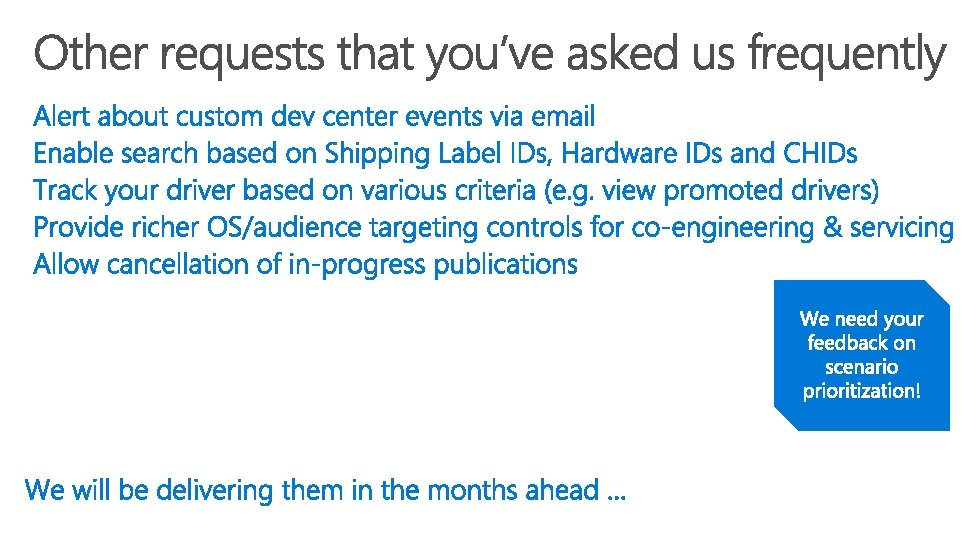 “Love the smooth processing!” “Search by INF name is a huge improvement!” “The additional control during resell is a huge help. ” “The processing of our biggest driver package takes only a little over an hour and we haven’t seen a single intermittent issue. Kudos!”
