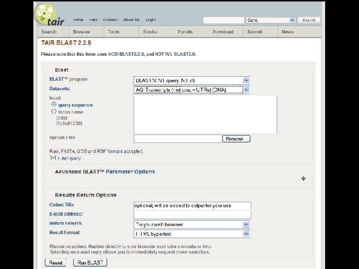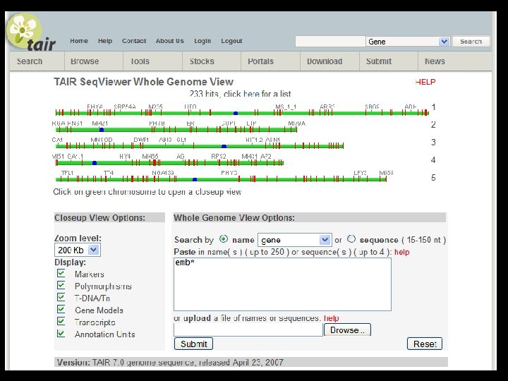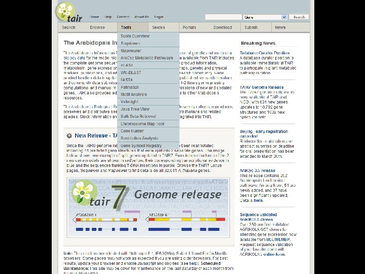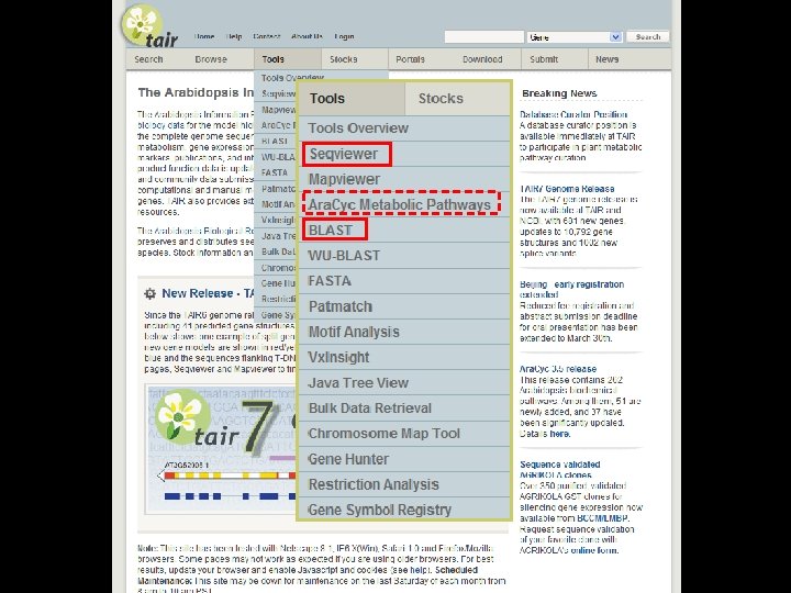 Most popular tools at TAIR BLAST p Genome Browsers p n n p Seq. Viewer GBrowse (coming soon) Ara. Cyc