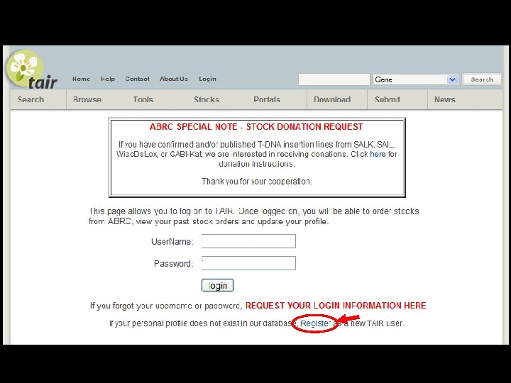 How to order stocks at TAIR Register yourself at TAIR p Associate yourself to a lab p Wait 1 -2 days for account activation p Search for seed or DNA stocks p Order stocks p Pay by credit card, check or money order p