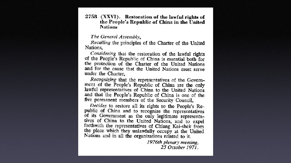 25 October 1971 26 th session of the UN General Assembly • For these unlawful, undemocratic and martial rule conditions, UN General Assembly met • Resolution 2758, • 76 votes in favor, 35 against and 17 abstentions. • PRC as “the only legitimate representative of China to the United Nations” and “one of the five permanent members of the Security Council. ”