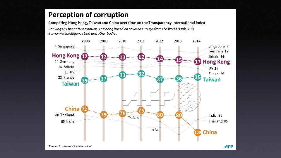 Curruption Scandal • There was a corruption scandal in 2008 and “Taiwanese prosecutors say they have enough evidence to charge President Chen Shui-bian with corruption - but he is protected by presidential immunity • Wounding process still continue. In this context, we can say still there are corruption problem in Taiwan. • Taiwan score is 61 out of 100 (100 is not corrupted), rank is 31 out of 176 countries