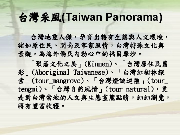 The ecology of plants 【The community of herbaceous plant】 In general, we can usually see some plants in Taiwan. ■ Blanket flower:This flower is stand for Penghu county. It’s come from the south of America and now we can see them everywhere in Penghu.