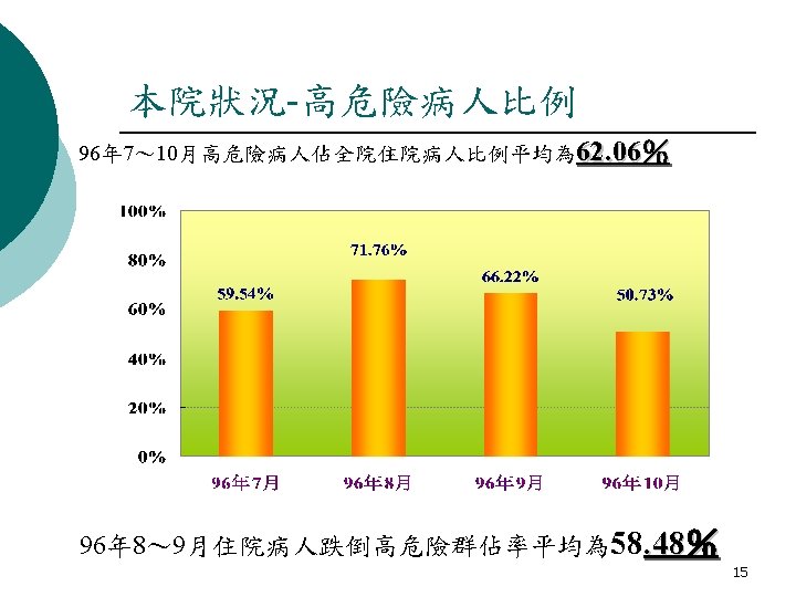 Reference ¡ ¡ ¡ 醫策會 International Quality Indicator Project. Center for Performance Sciences, 2001 Paul C. Walker, Ahemad Alrawi, john F. Mitcjell, Randolph E. Regal, and Ujjaini Khanderia. Medication use as a risk factor falls among hospitalized elderly patients. Am J Health-Syst Pharm. 2005; 62: 2495 -9 Carol A. Miller, RNC, MSN. The connection between drugs and falls in elders. Geriatric Nursing 2002; 23 (2): 109 -110 66