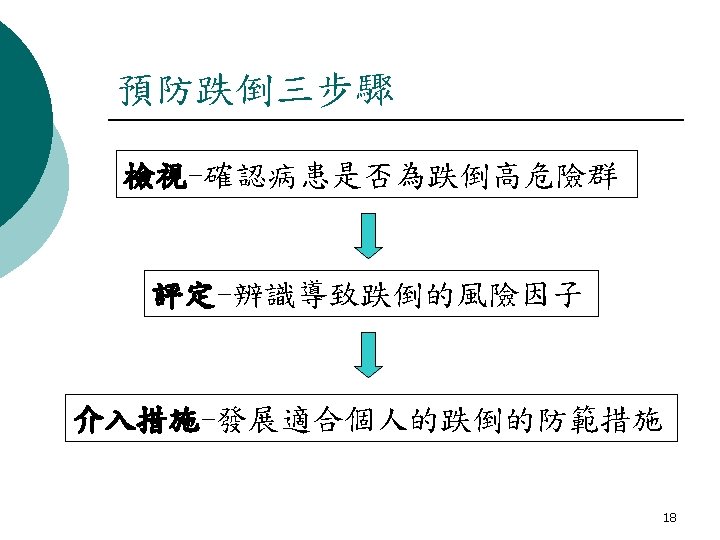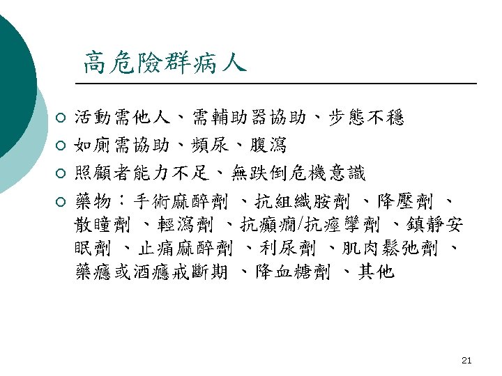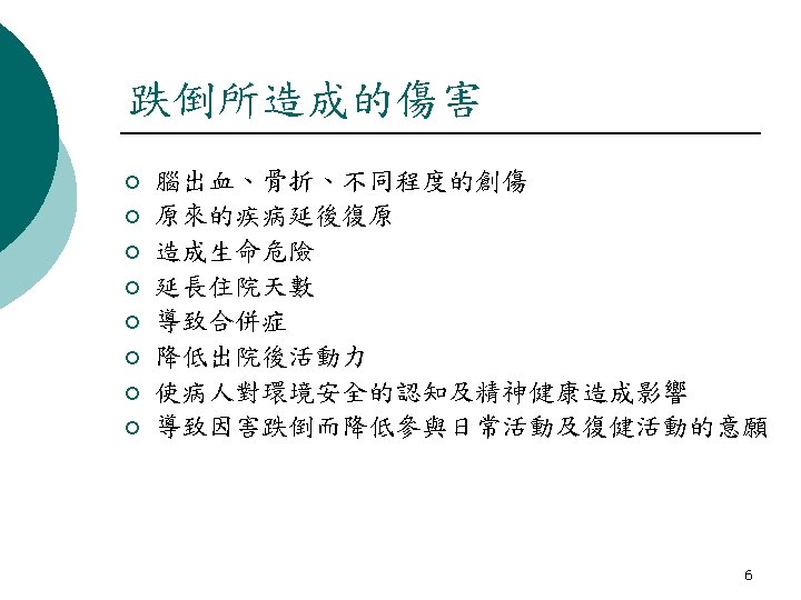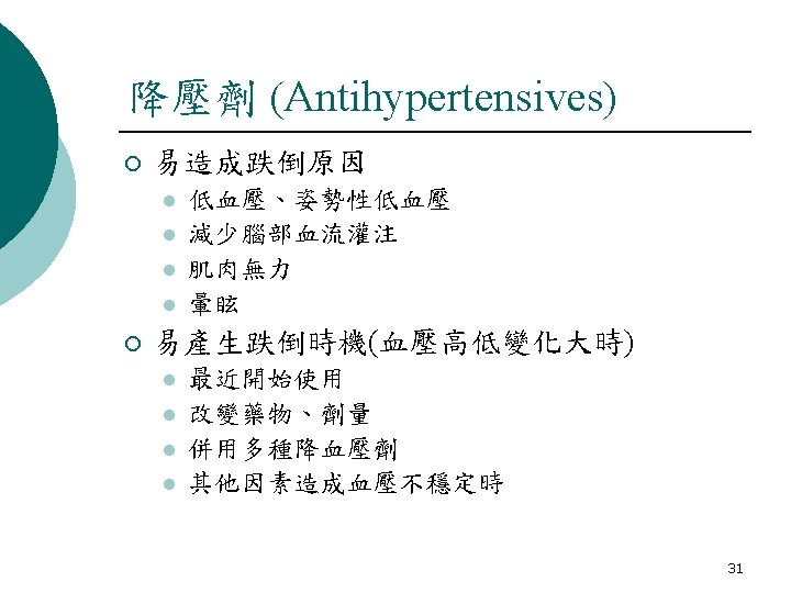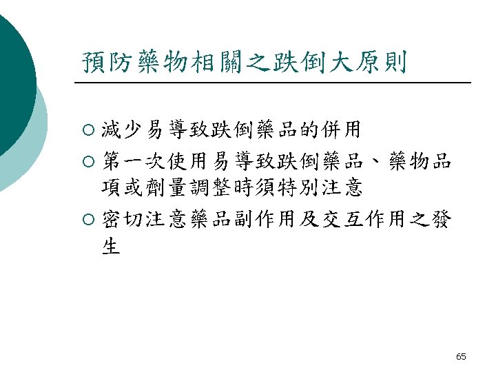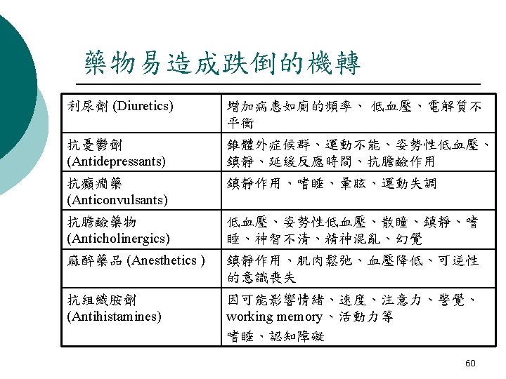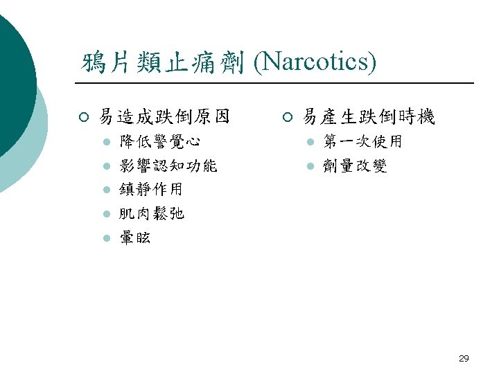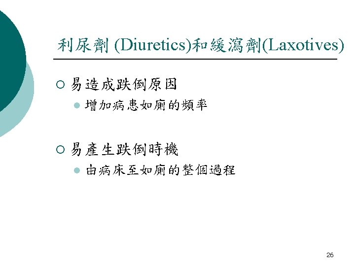 藥物會增加跌倒風險 ¡服用任何會產生下列作用的藥物,都 會 ¡ Orthostatic hypotension ¡ 增加病人跌倒的機率 Confusion 混亂 ¡ ¡ Depression 憂鬱 Sedation 鎮靜 Arrhythmia 心律不整 Hypovolemia ¡ ¡ ¡ 姿勢性低血壓 Delayed reaction time 延緩反應時間 Diminished cognitive function 認知功能減損 Change in gait and balance 步伐不穩 25