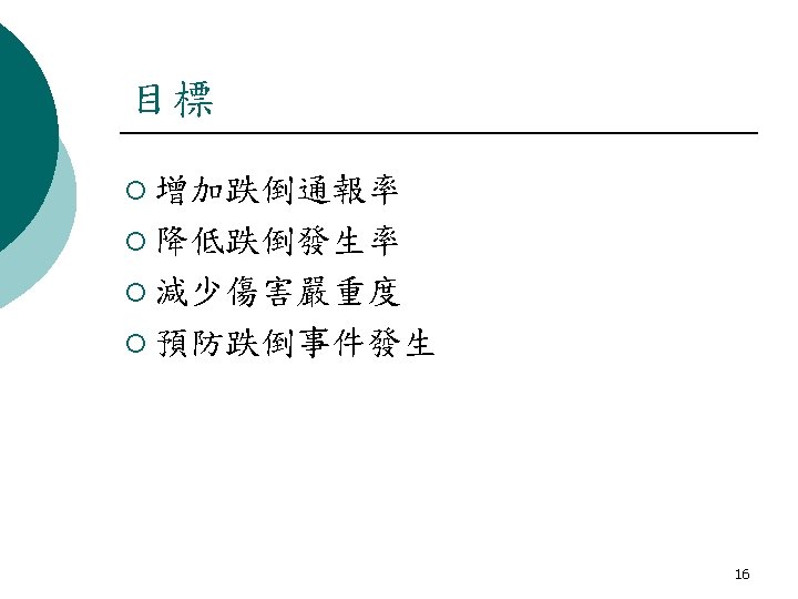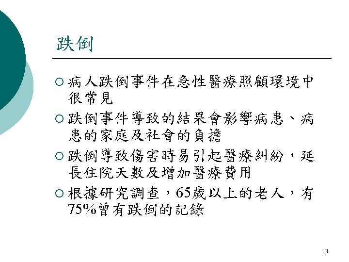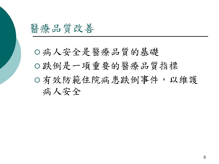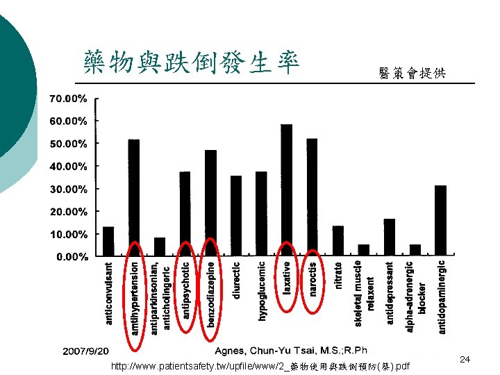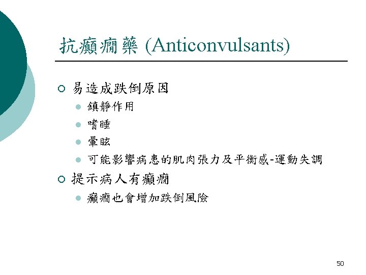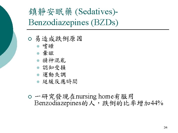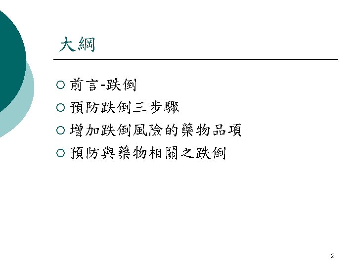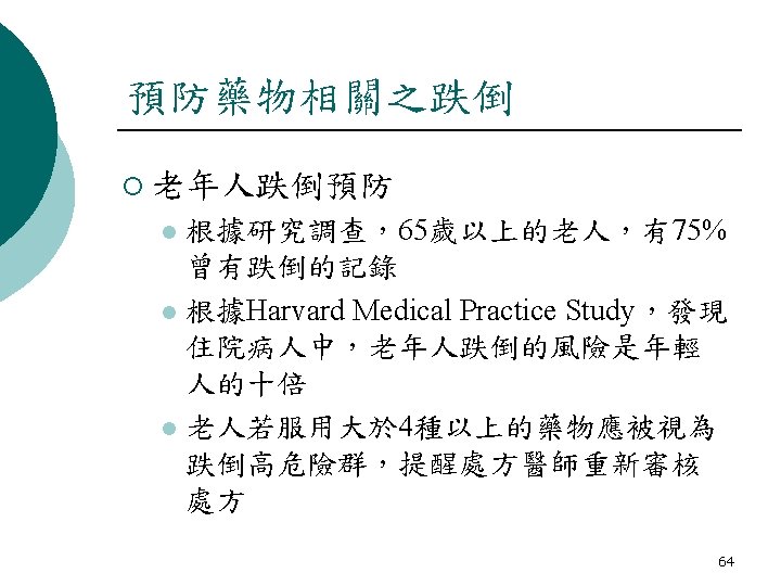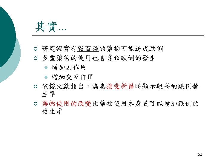 藥物會增加跌倒風險 ¡服用任何會產生下列作用的藥物,都 會 ¡ Orthostatic hypotension ¡ 增加病人跌倒的機率 Confusion 混亂 ¡ ¡ Depression 憂鬱 Sedation 鎮靜 Arrhythmia 心律不整 Hypovolemia ¡ ¡ ¡ 姿勢性低血壓 Delayed reaction time 延緩反應時間 Diminished cognitive function 認知功能減損 Change in gait and balance 步伐不穩 25