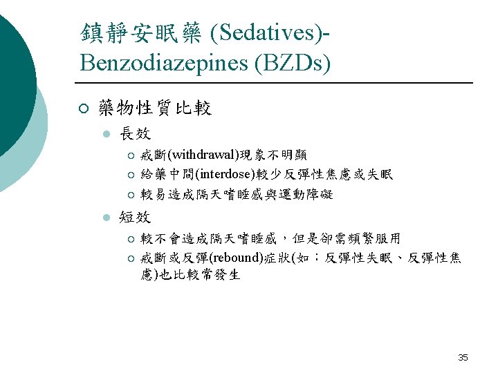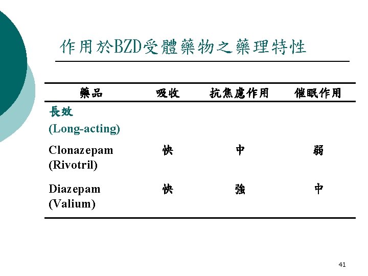 作用於BZD受體藥物之藥理特性 藥品 吸收 抗焦慮作用 催眠作用 Lorazepam (Ativan) 中 強 中 Lormetazepam (Loramet) 中 弱 強 Oxazolam (Serenal) 中 中 弱 中效 (Intermediate) 40