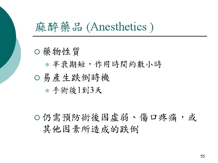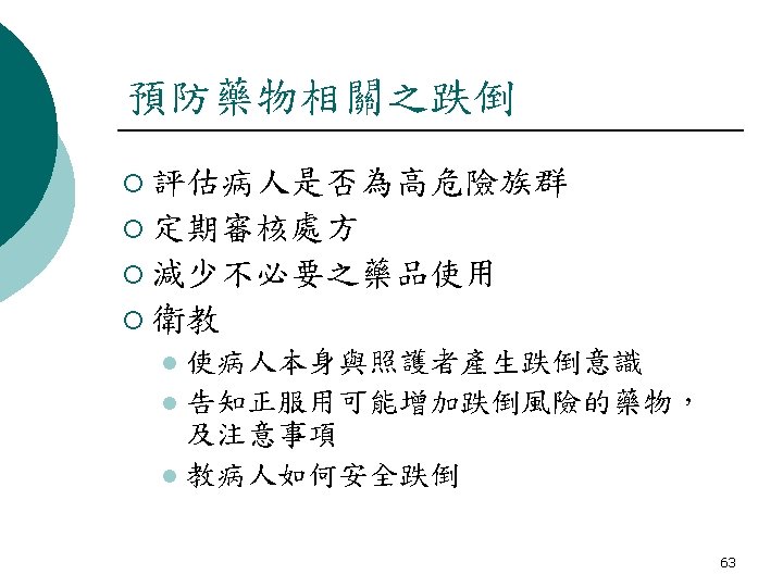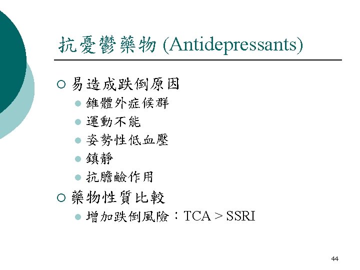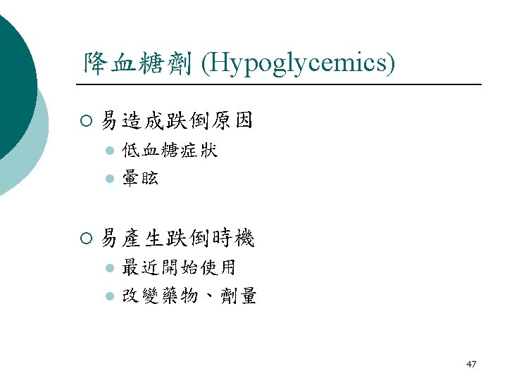 Psychotropics抗精神病藥物 (Antipsychotics)和抗憂鬱劑 (Antidepressants) ¡ 實證顯示所有種類的Psychotropics都會 增加老年人跌倒的機率 ¡ 應盡可能減少Psychotropics的使用 46