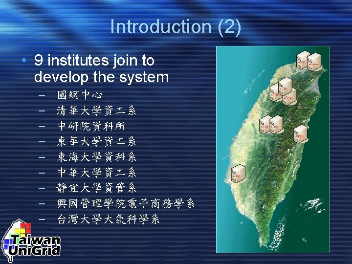 Introduction (1) • The purpose of grid computing is to integrate various resources within a large network environment. • The purpose of the Uni. Grid project is to build a platform for academic research using grid-related technologies in Taiwan.