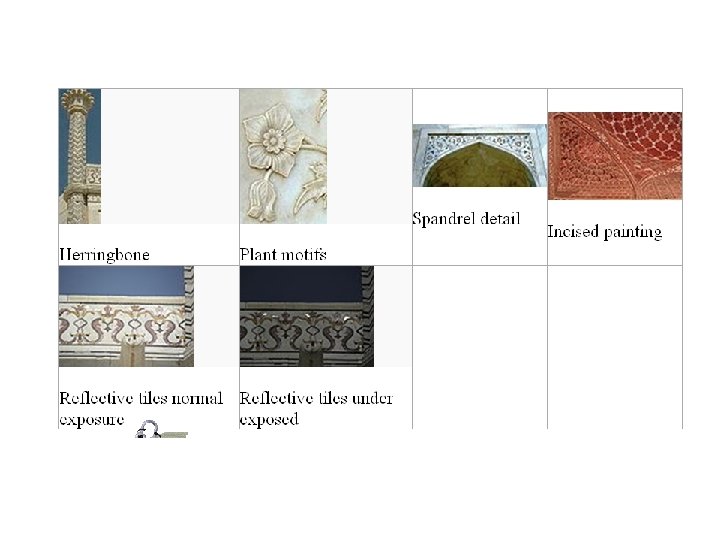 • • The exterior decorations of the Taj Mahal are among the finest to be found in Mughal architecture. As the surface area changes the decorations are refined proportionally. The decorative elements were created by applying paint, stucco, stone inlays, or carvings. In line with the Islamic prohibition against the use of anthropomorphic forms, the decorative elements can be grouped into either calligraphy, abstract forms or vegetative motifs.