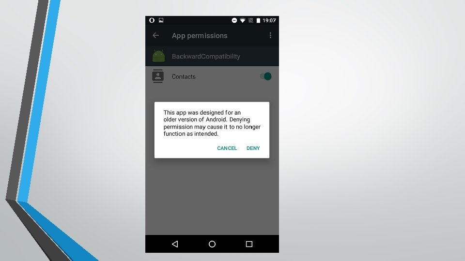 Backward Compatibility • Legacy apps work as usual on Android 6. 0 • Ask for permissions at install time. • Users can still revoke the granted permissions! • Application doesn’t get any exception (read crash) for not having permission. • Application get null or 0 as a return