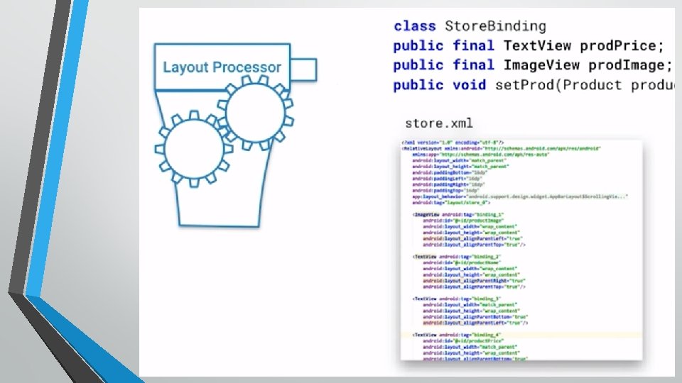 Data binding library (Beta) • • Write apps faster. Minimize glue code for UI. • • • No more find. View. By. Id(R. id…) Bind data and UI with minimum lines of code. Move basic UI logic from java class to xml layout file. Bind data (custom variables) and events. Define custom attributes. Supported all the way back to Android 2. 1 Available on android studio 1. 3+ (Gradle plugin 1. 5+ required)