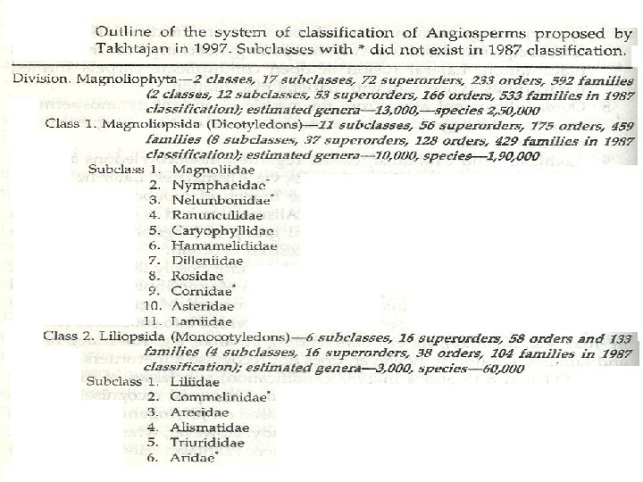 Takhtajan divided the Magnoliophyta (Angiosperms) into two Classes – Magnoliopsida (Dicotyledons) Liliopsida (Monocotyledons) Of which Magnoliopsida is considered primitive and Liliopsida to have been derived from Magnoliales under Magnoliopsida.