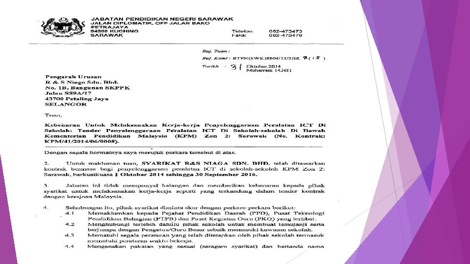 Sewaktu Pihak Kontraktor Hadir. Pastikan kontraktor yang hadir mempunyai pakaian seragam, kad pekerja dan surat kebenaran dari pihak syarikat sebagai wakil syarikat. - R&S Niaga SDN. BHD Kontraktor perlu memaklumkan kepada pihak sekolah lebih awal sebelum penyenggaraan dilaksanakan. Pastikan kontraktor melapor diri dan memohon kebenaran daripada pihak sekolah. Pihak sekolah berhak untuk tidak membenarkan kontraktor menjalankan kerja penyenggaraan tanpa sebarang amaran.
