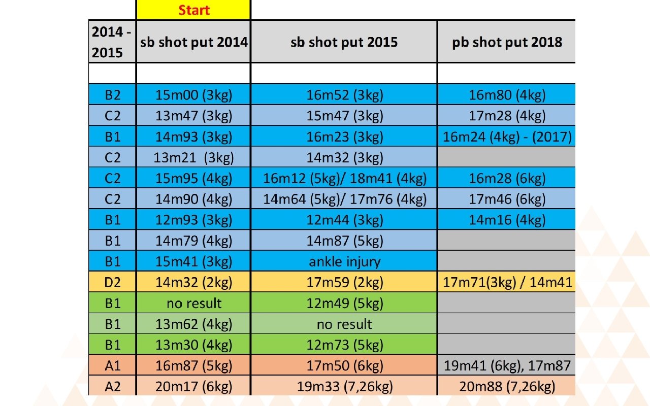 Program set up & evaluation: • 1 on 1 with the athlete – formal and informal - goal setting - points to improve • Distances thrown in training • Testing – mostly while throwing and during training camps - shot put backward and forward - standing long jump • Distances thrown in competition