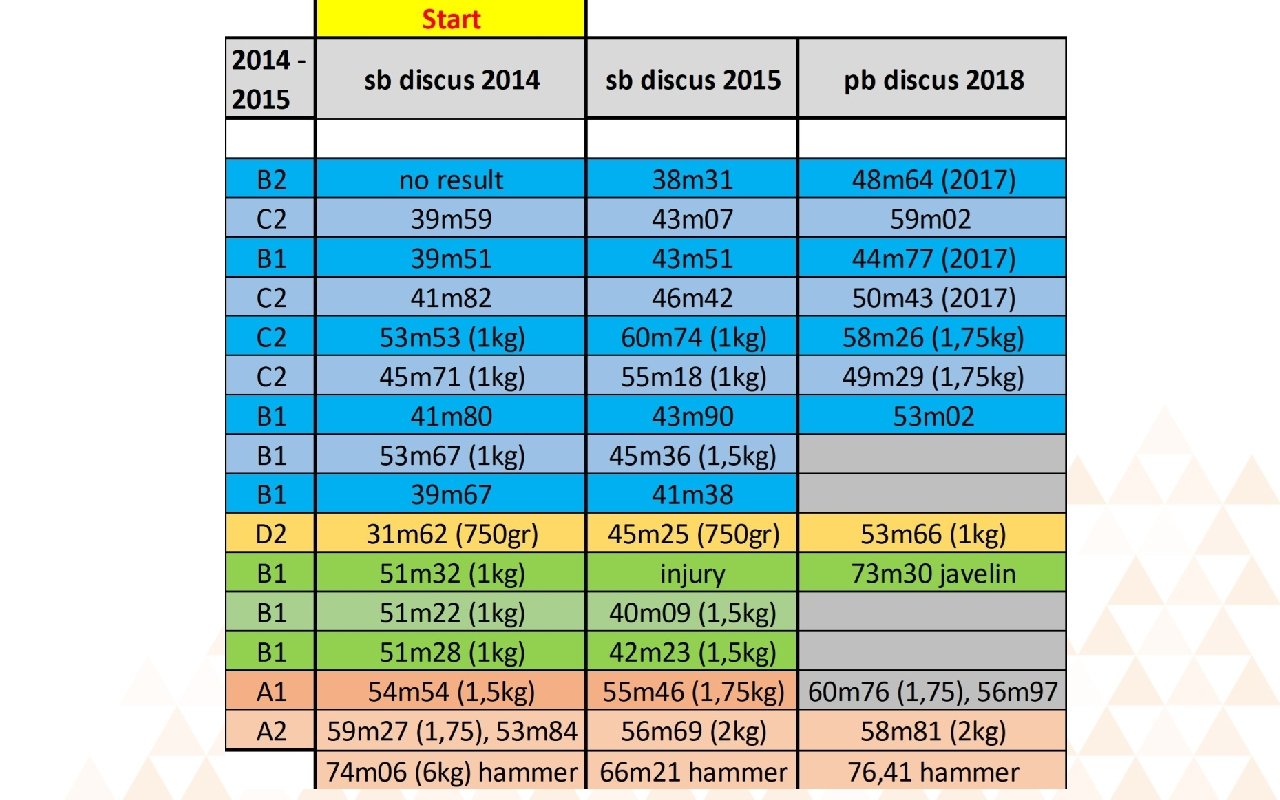 The approach • 1 weekend with all 12 throwers • 5 national training Saturdays with 6 athletes • One final training with all 12 throwers • Some testing • Warming-up – Training – Lunch – Analysis with trainers and athletes – Training • Some program intervention & help