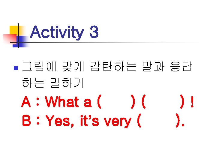 tall tower What a tall tower tall man Slides: 64 Download presentation tall / tower What a tall tower! tall / man What a tall man! nice / day What a nice day! beautiful / sky What a beautiful sky! beautiful / bird What a beautiful bird! beautiful / flower What a beautiful flower! big / city What a big city! big / elephant What a big elephant! fast / ball What a fast ball! nice / house What a nice house! handsome / man What a handsome man! beautiful / woman What a beautiful woman! small / island What a small island! cute / baby What a cute baby! slow / turtle What a slow turtle! What a tall tower! What a beautiful sky! What a beautiful flower! What a small island! What a nice house! What a nice day! What a cute baby! What a beautiful bird! What a tall man! What a big city! What a big elephant! What a beautiful woman! What a fast ball! What a handsome man! What a slow turtle! tall / tower A : What a tall tower! B : Yes, it’s very tall. tall / man A : What a tall man! B : Yes, it’s very tall. nice / day A : What a nice day! B : Yes, it’s very nice. beautiful / sky A : What a beautiful sky! B : Yes, it’s very beautiful. beautiful / bird A : What a beautiful bird! B : Yes, it’s very beautiful. beautiful / flower A : What a beautiful flower! B : Yes, it’s very beautiful. big / city A : What a big city! B : Yes, it’s very big. big / elephant A : What a big elephant! B : Yes, it’s very big. fast / ball A : What a fast ball! B : Yes, it’s very fast. nice / house A : What a nice house! B : Yes, it’s very nice. handsome / man A : What a handsome man! B : Yes, it’s very handsome. beautiful / woman A : What a beautiful woman! B : Yes, it’s very beautiful. small / island A : What a small island! B : Yes, it’s very small. cute / baby A : What a cute baby! B : Yes, it’s very cute. slow / turtle A : What a slow turtle! B : Yes, it’s very slow.