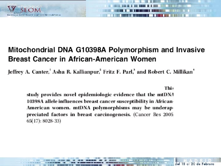 Textbooks Genetics - Harper PS. Practical Genetic Counselling. Oxford University Press, sixth edition, 2004 - Nussbaum R, Mc. Innes R, Willard H. Thompson & Thompson Genetics in Medicine. 7 edition. Saunders, 2007 Hereditary Cancer - Eeles RA, Easton DF, Ponder BAJ, Eng C. Genetic predisposition to cancer. Oxford University Press, second edition, 2004 - Vogelstein B, Kinzler KW. The Genetic Basis of Human Cancer. Mc. Graw-Hill, second edition, 2002 Genetic Glossary - Glosario de Genética http: //www. institutoroche. com/glosario. php? paraula 1=a Databases Genetics Online Mendelian Inheritance In Man http: //www. ncbi. nlm. nih. gov/sites/entrez? db=omim Associations Genetics Asociación Española de Genética Humana (AEGH) www. aegh. org