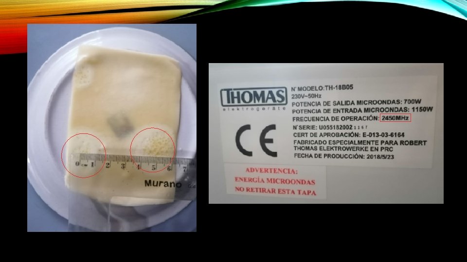 PROCEDIMIENTO EXPERIMENTAL • Luego de tener el montaje armado, prender el microondas de 5 a 7 segundos, luego observar el queso, sin retirar el plato del horno de microondas, para ver si se forma dos marcas definidas en el queso. • Estas marcas serán círculos donde el queso comienza a derretirse. • En caso que no se formen las marcas, tendrá que repetir el proceso anterior hasta conseguir marcas definidas en la lámina. • Cuando hayamos conseguido las marcas, sacar el queso del microondas y medir con regla la distancia entre ellas. Recuerda que como se formaron marcas circulares la medición debe ser desde el centro de una marca al centro de la otra