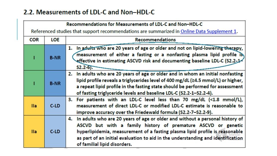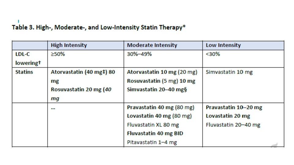 10: Evaluar la adherencia y el porcentaje de respuesta a los medicamentos que disminuyen el LDL-C y los cambios en el estilo de vida con la medición repetida de lípidos 4 a 12 semanas después del inicio de la estatina o el ajuste de la dosis, se repite cada 3 a 12 meses según sea necesario. Definir las respuestas al estilo de vida y la terapia con estatinas porcentaje de reducción en los niveles de LDL-C en comparación con la línea de base. En pacientes con ASCVD de alto riesgo, desencadenantes de la adición de un tratamiento farmacológico sin estatinas se define por los niveles umbrales de LDL-C ≥ 70 mg / d. L (≥ 1. 8 mmol / L) en máxima terapia con estatinas.