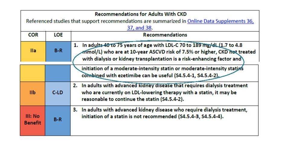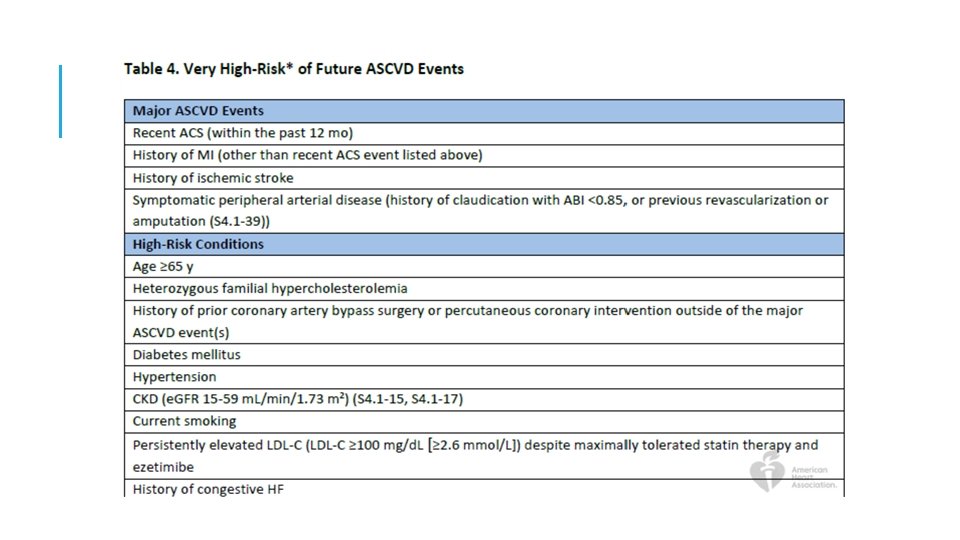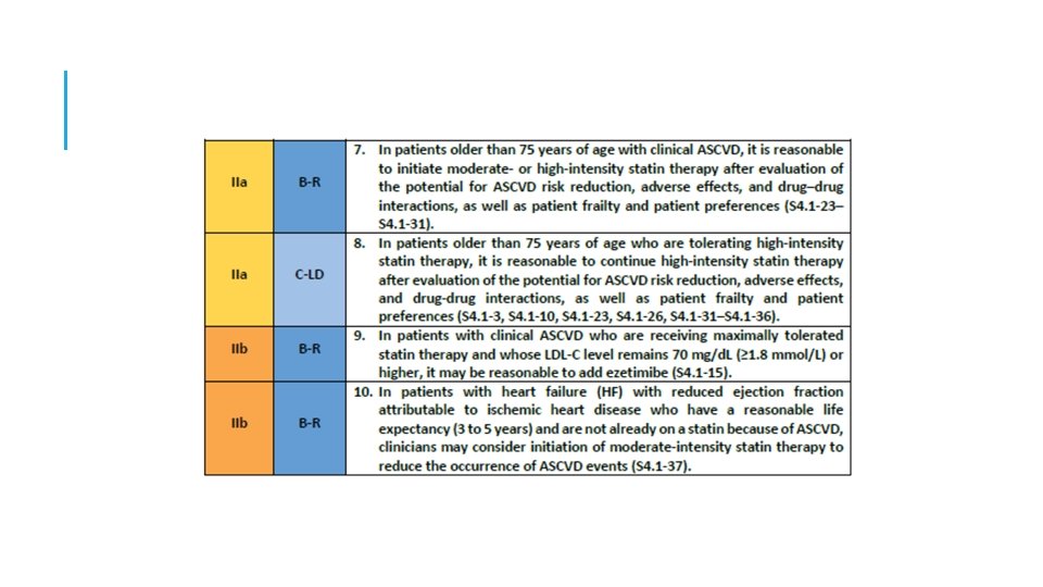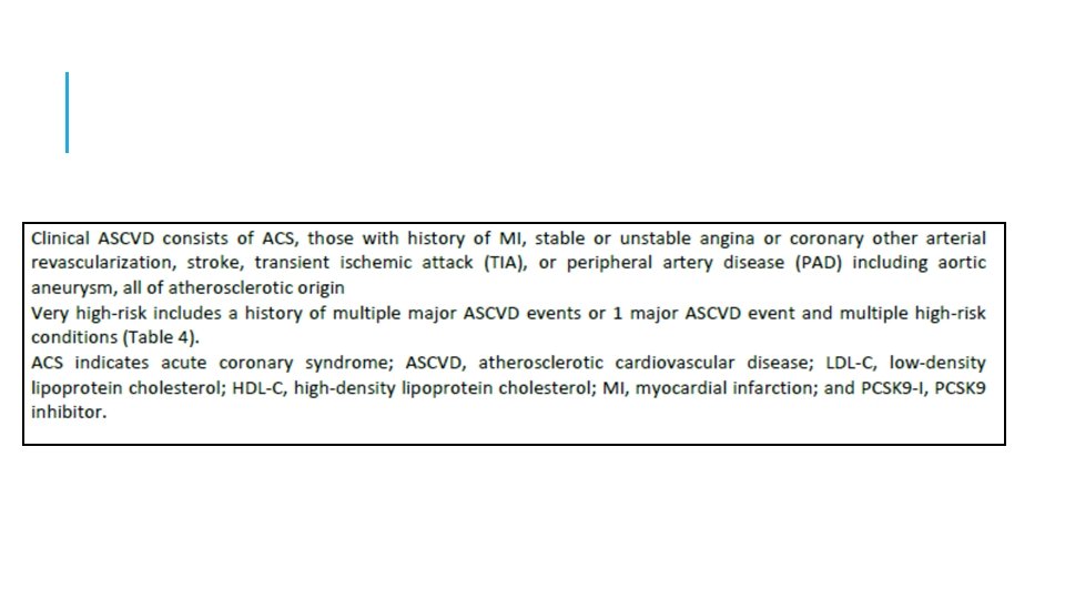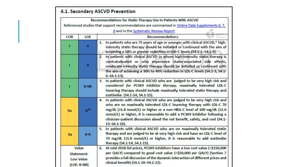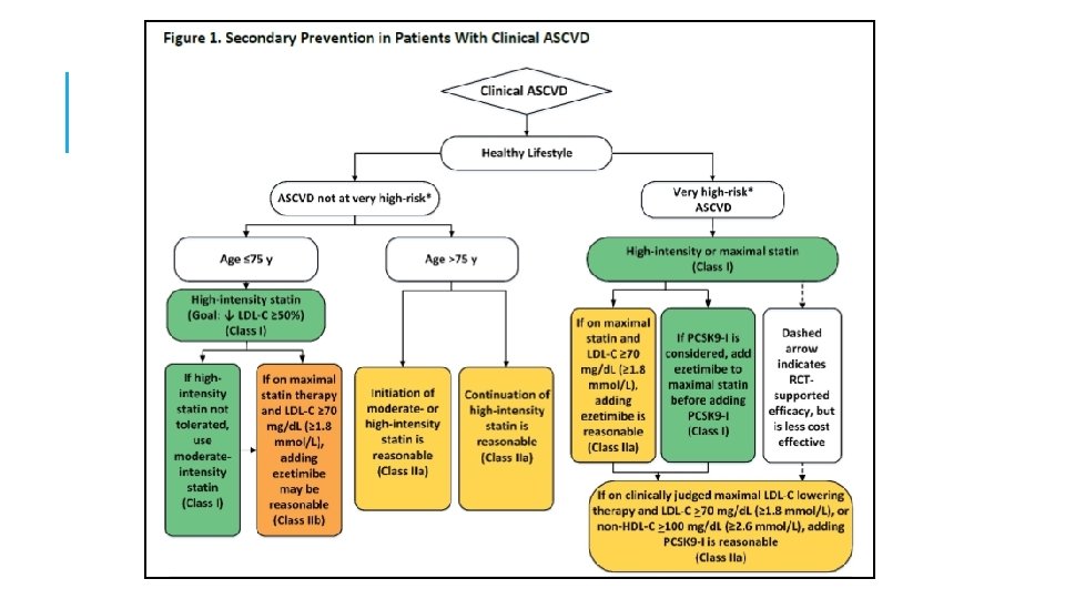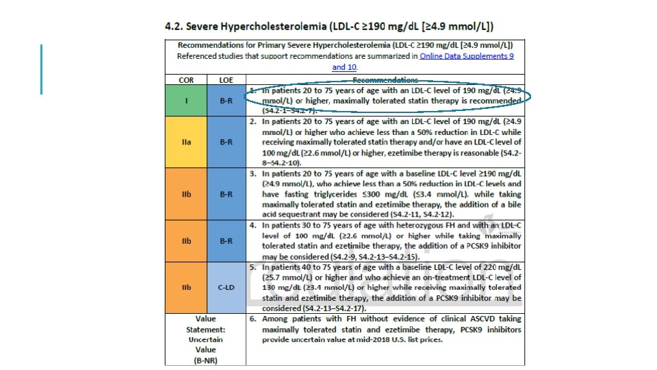 3: En ASCVD de muy alto riesgo, use un umbral de LDL-C de 70 mg / d. L (1. 8 mmol / L) para considerar la adición de no estatinas a la terapia con estatinas. Muy alto riesgo incluye un historial de varios eventos importantes de ASCVD ó 1 gran evento ASCVD y múltiples condiciones de alto riesgo. En pacientes con ASCVD de muy alto riesgo, es razonable agregar ezetimibe a la terapia con estatinas máxima tolerada cuando el nivel de LDL-C permanece en ≥ 70 mg / d. L (≥ 1. 8 mmol / L). En pacientes con un riesgo muy alto cuyo nivel de LDL-C permanece ≥ 70 mg / d. L (≥ 1. 8 mmol / L) en tratamiento con estatinas y ezetimiba de máxima tolerancia, agregar un inhibidor de PCSK 9 es razonable, aunque la seguridad a largo plazo (> 3 años) es incierta y la efectividad es baja a mediados de 2018.