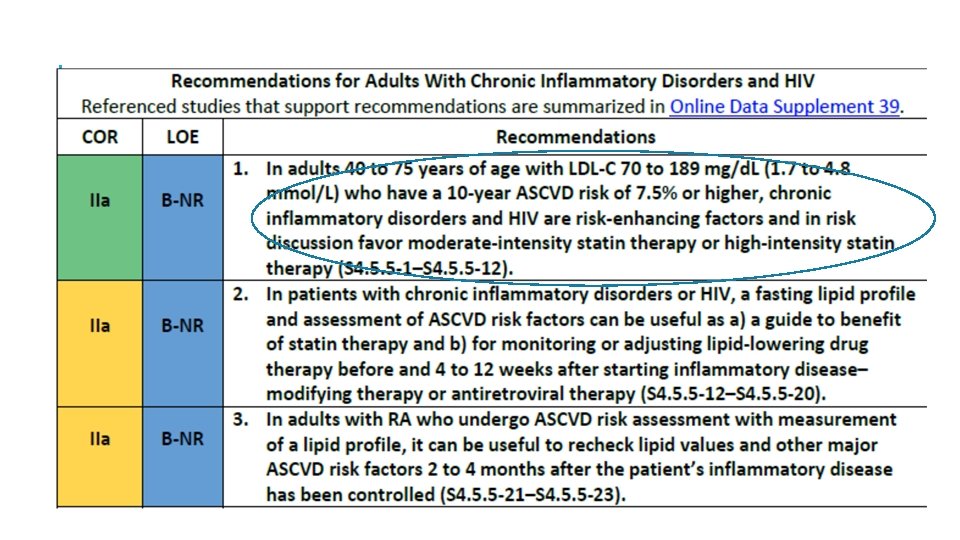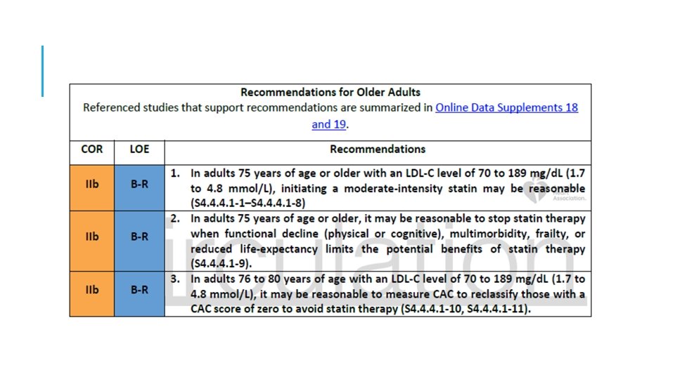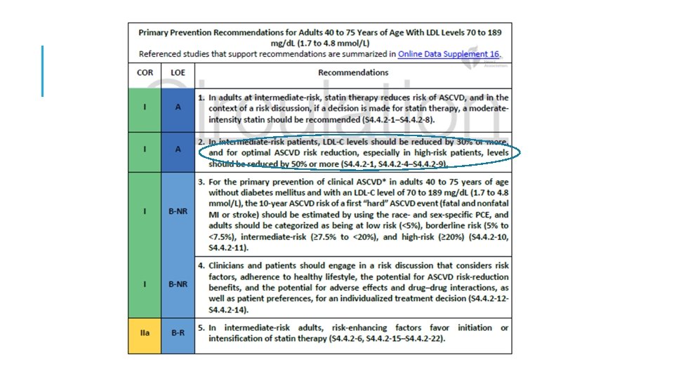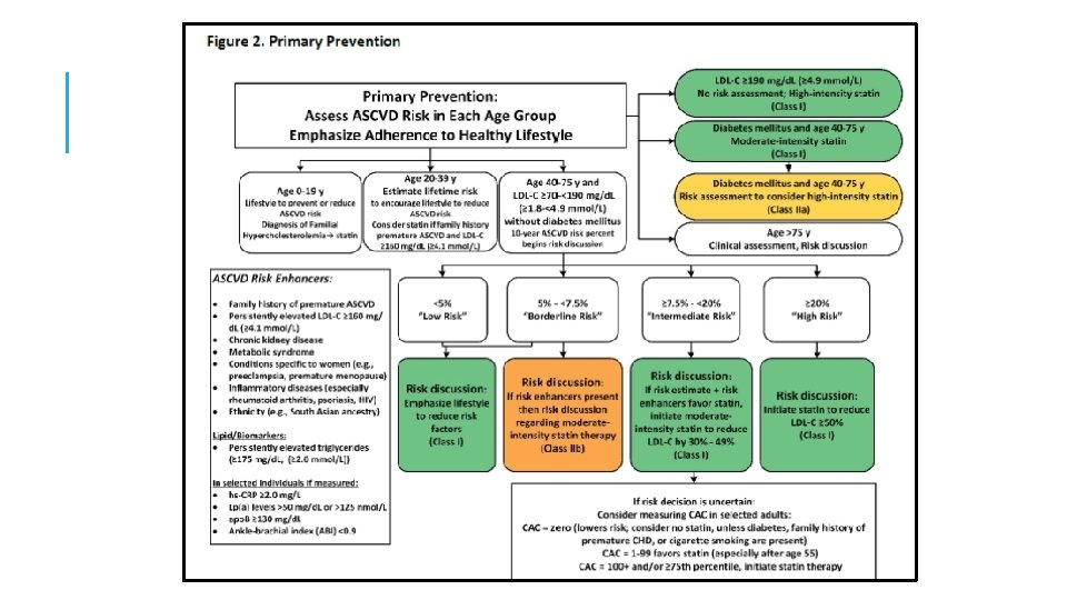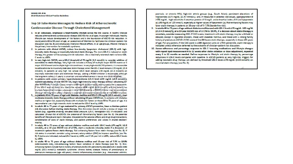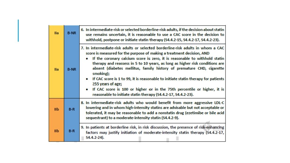 9: En adultos de 40 a 75 años de edad sin diabetes mellitus y con niveles de LDL-C ≥ 70 mg / d. L-189 mg / d. L (≥ 1. 8 -4. 9 mmol / l), a un riesgo ASCVD a 10 años de ≥ 7. 5% a 19. 9%, si se toma una decisión sobre el tratamiento con estatinas incierto, considere medir CAC. Si el CAC es cero, el tratamiento con estatinas puede ser suspendido o retrasados, excepto en los fumadores de cigarrillos, aquellos con diabetes mellitus y aquellos con una fuerte Historia Familiar del ASCVD prematuro. Una puntuación CAC de 1 a 99 favorece el tratamiento con estatinas, especialmente en ≥ 55 años de edad. Para cualquier paciente, si la puntuación CAC es ≥ 100 unidades Agatston ó ≥ 75 percentil, la terapia con estatinas es indicado a menos que sea diferido por el resultado de la discusión de riesgo médico-paciente. *calcio en la arteria coronaria (CAC)