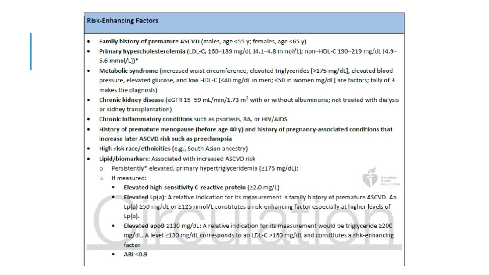 8: En adultos de 40 a 75 años de edad sin diabetes mellitus y riesgo de 10 años de 7, 5% a 19, 9%, (riesgo intermedio), los factores que aumentan el riesgo favorecen el inicio del tratamiento con estatinas. Los factores de riesgo incluyen la historia familiar de ASCVD prematura; niveles de LDL-C persistentemente elevados ≥ 160 mg / d. L (≥ 4. 1 mmol / L); síndrome metabólico; enfermedad renal crónica; historia de preeclampsia o menopausia prematura (edad <40 años); trastornos inflamatorios crónicos (por ejemplo, artritis reumatoide, psoriasis o VIH crónico); grupos étnicos de alto riesgo (por ejemplo, sur de Asia); elevaciones persistentes de triglicéridos ≥ 175 mg / d. L (≥ 1. 97 mmol / L); y, si se mide en individuos seleccionados, apolipoproteína B ≥ 130 mg / d. L, proteína C reactiva de alta sensibilidad ≥ 2, 0 mg / L, índice tobillo-brazo <0, 9 y lipoproteína (a) ≥ 50 mg / d. L ó 125 nmol / L, especialmente a valores más altos de lipoproteínas (a). Los factores que aumentan el riesgo pueden favorecer el tratamiento con estatinas en pacientes con riesgo a 10 años de 5 -7. 5% (riesgo límite).