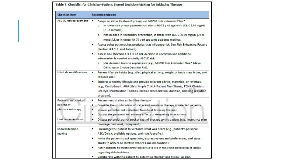 7: En adultos de 40 a 75 años sin diabetes mellitus y con niveles de LDLC ≥ 70 mg / d. L (≥ 1. 8 mmol / L), con un riesgo de ASCVD a 10 años de ≥ 7. 5%, comience una estatina de intensidad moderada si tras plantear las opciones de tratamiento favorecen el tratamiento con estatinas. Los factores que aumentan el riesgo favorecen el tratamiento con estatinas. Si el estado de riesgo es incierto, considere el uso de calcio en la arteria coronaria (CAC) para mejorar la especificidad. Si se indican las estatinas, reduzca los niveles de LDL-C en ≥ 30%, y si el riesgo a 10 años es ≥ 20%, reduzca los niveles de LDL-C por ≥ 50%.