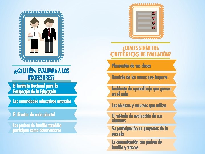 • La Ley establece reglas para propiciar evaluaciones justas que dignifiquen la profesión docente y ayuden a mejorar los procesos y resultados. • Para la promoción, se establece que la evaluación es el criterio central, en función de los conocimientos y las capacidades de los aspirantes. • Para la permanencia, la Ley prevé la aplicación de una evaluación integral que permita conocer el desempeño de docentes, directivos y supervisores • Las evaluaciones que se lleven a cabo conforme a la ley serán transparentes, objetivas y justas. * LEY DEL SERVICIO PROFESIONAL DOCENTE