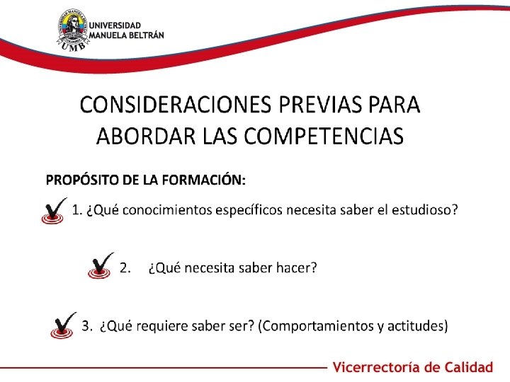 PARÁMETROS DEL MODELO DE EVALUACIÓN • La Universidad Manuela Beltrán tiene contemplado dentro del modelo de evaluación los siguientes parámetros: - Pruebas Objetivas: Son las pruebas aplicadas a través del computador las cuales evalúa el componente teórico de las diferentes asignaturas que hacen parte del currículo de los programas. - Pruebas de ejecución. -Lista de chequeo: Son utilizadas con el fin de evaluar el componente practico de las asignaturas, laboratorios y asignaturas de Investigación asegurando criterios objetivos e igualitarios entre los diferentes programas. - Peso Porcentual de la evaluación: El peso de cada uno de las estrategias de evaluación se debe revisar de acuerdo a la naturaleza de la asignatura y que contemple cada una de las estrategias de evaluación (parciales vs evaluación en aula de clase vs trabajo autónomo en casa)