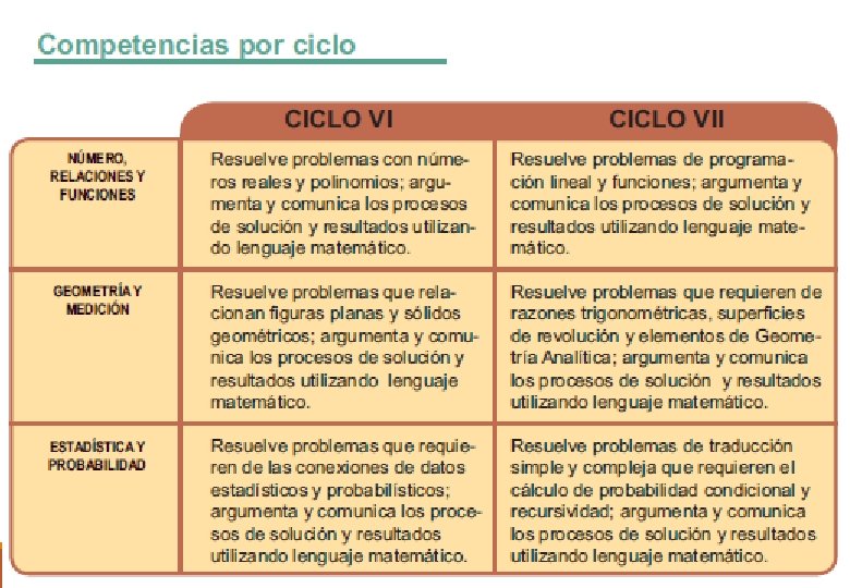 ORGANIZACIÓN DE LAS ÁREAS COMPETENCIAS Describen los logros que alcanzarán los estudiantes en cada ciclo de la EBR, expresados en actuaciones idóneas o un saber hacer APLICADO, según el área curricular. CAPACIDADES CONOCIMIENTOS Describen los aprendizajes que se espera alcancen los estudiantes en cada grado en función de las competencias del área. Pueden ser cognitivas, motoras o socio afectivas. Presentan los datos, teorías, leyes, hechos, etc. provenientes de las disciplinas involucradas en el área curricular, que sirven como medio para el desarrollo de las capacidades. ACTITUDES Describen el comportamiento de los estudiantes, en función de los valores previstos y las competencias del área curricular.