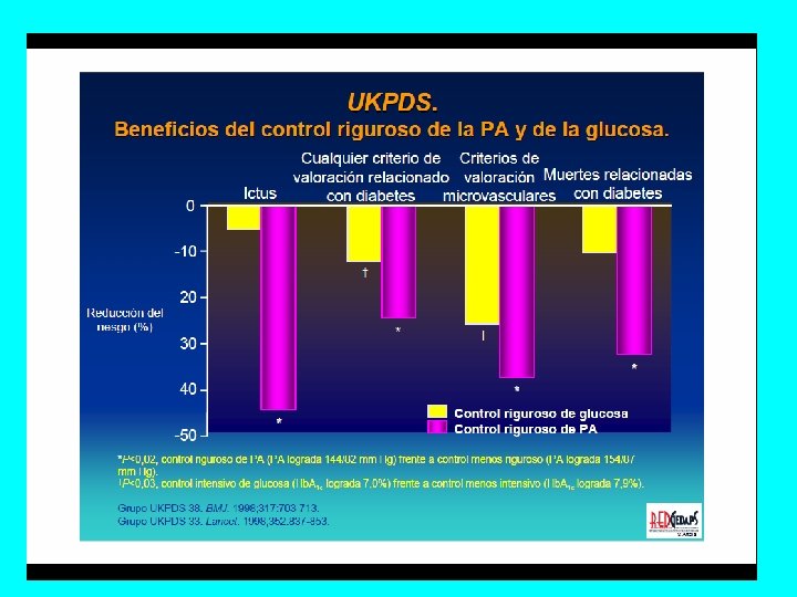 Eficacia del control glucémico. Tres estudios en el año 2008 … mucha polémica Perfil de pacientes con DM 2 ACCORD N=10251 ADVANCE N=11140 VADT N=1791 VADT Hb. A 1 c final Hb. A 1 c Años entrada Estand Intens Muertes (%) Intensivo Estándar Resultado control intensivo Hipos Severas (% ) 62 años 35% ECV Evol DM>10 a 3, 5 8, 1 7, 5 6, 4 5, 0 muertes (detenido) eventos CV (ns) 66 años 32% ECV Evol DM>8 a 7, 5 7, 2 7, 3 6, 5 8, 9 9, 6 nefropatía retinopatía eventos CV 2, 7 vs 1, 5 5 9, 4 8, 4 6, 9 10 10 microvascular 20, 0 vs 8, 8 60 años 40% ECV Evol DM=11, 5 a 97% hombres ACCORD. NEJM 2008; 358: 2545 -59 VADT. NEJM. 2009; 360: 129 -39 ADVANCE. NEJM 2008; 358: 2560 -72 muerte CV (ns) eventos CV (ns) 16, 2 vs 5, 1