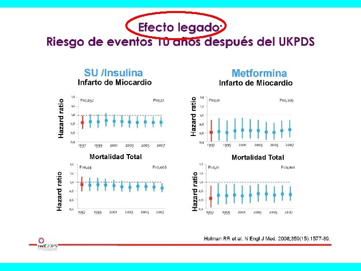 Riesgo DM vs CI: Corto plazo No DM - No CI No DM - CI previa DM - No CI DM-CI previa Mortalidad C-V (%) 45 35 a 25 Seguimiento en años 4 15 5 7 5 2 Haffner, 1998 (2. 432 ) OASIS, 2000 (8. 013 ) PHS, 2001 (91. 285 ) Evans, 2002 (10. 891 )