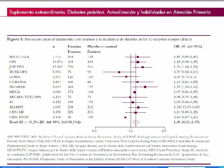 USO DE ESTATINAS Y RIESGO AUMENTADO DE DIABETES Statin therapy and risk of developing type 2 diabetes: a meta-analysis. Rajpathak SN, Kumbhani DJ, Crandall J, Barzilai N, Alderman M, Ridker PM. Diabetes Care. 2009 Oct; 32(10): 1924 -9. Aunque la terapia con estatinas disminuye en gran medida el riesgo Statins and risk of vascular, incluso entre diabéticos o con riesgo aumentado dea incident diabetes: diabetes, collaborative metaanalysis of La relación de la terapia con estatinas y la incidencia de diabetes randomised statin sigue siendo incierta. trials. Sattar N, Preiss D, et al. Lancet 2010 Futuros ensayos con estatinas deberían estar diseñados para abordar formalmente el tema. Feb 27; 375(9716): 735 Lancet 2010 Feb 27; 375(9716): 735 -42. Risk of incident