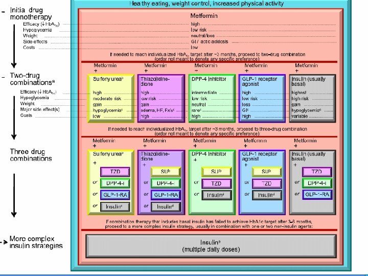 ALGORITMO CANADIAN DIABETES ASSOCIATION 2008 Intervenciones sobre estilos de vida (dieta y actividad física) Hb. A 1 c<9% Hb. A 1 c>9% Fármacos sin esperar efecto estilos de vida Metformina E S T I L O S V I D A Insulina ± Metformina Si no se alcanza objetivo → Añadir otro fármaco según ventajas e inconvenientes Familia Hb. A 1 c Hipos Ventajas Inconvenientes Glitazona Rara Monoterapia persistente Necesita 6 -12 semanas para máx efecto Aumento de peso Edema, I. Cardiaca, fracturas en mujeres Inhib Alfaglucos Rara Control glucemia postprandial Peso neutral Efectos gastrointestinal o Rara Control glucemia postprandial Peso neutral Nuevo (seguridad desconocida) Si No tope de dosis Pautas flexibles Ganancia peso Meglitinida o Sí Control glucemia postprandial Requiere 2 -3 dosis Sulfonilurea Sí Las nuevas menos hipoglucemias Ganancia peso Perdida peso No Pérdida peso Efectos gastrointest inal (Orlistat) Aumento frec cardiaca (sibutramina) Inhib DPP 4 d e • Metformina + otros F • Insulina Hiperglucemia sintomática y descompensación metabólica Insulina • Añadir otro F de diferente clase • Añadir insulina basal bedtime a los FO • Intensificar la dosis de insulina
