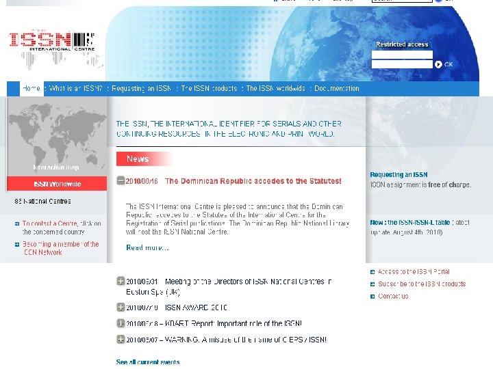 ISSN International Standard Serial Number Identificar cualquier título de publicación seriada sin importar su contenido, origen o idioma. ISSN = Título ISO 3295 -1975 NORMA ISO 3297 -2007 Sistema ISSN tiene su sede en París 75 sedes nacionales Es gratuito