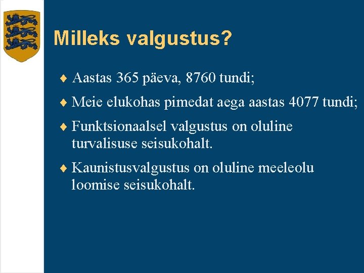 Milleks valgustus? ¨ Aastas 365 päeva, 8760 tundi; ¨ Meie elukohas pimedat aega aastas 4077 tundi; ¨ Funktsionaalsel valgustus on oluline turvalisuse seisukohalt. ¨ Kaunistusvalgustus on oluline meeleolu loomise seisukohalt.