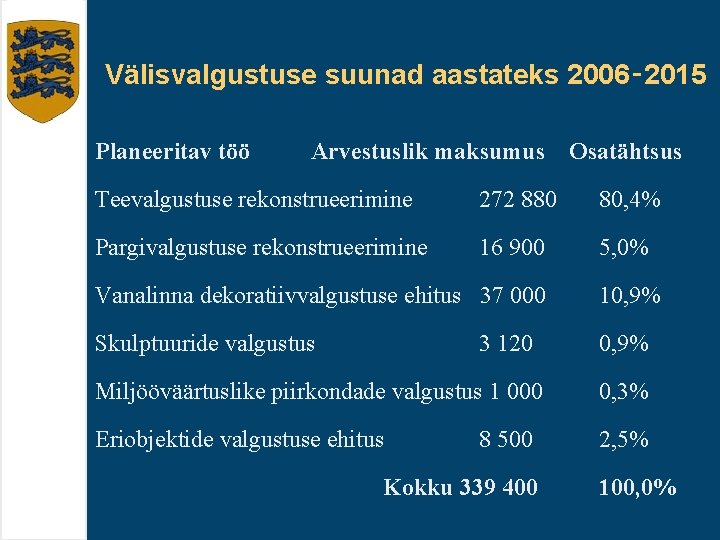 Välisvalgustuse suunad aastateks 2006‑ 2015 Planeeritav töö Arvestuslik maksumus Osatähtsus Teevalgustuse rekonstrueerimine 272 880 80, 4% Pargivalgustuse rekonstrueerimine 16 900 5, 0% Vanalinna dekoratiivvalgustuse ehitus 37 000 10, 9% Skulptuuride valgustus 0, 9% 3 120 Miljööväärtuslike piirkondade valgustus 1 000 0, 3% Eriobjektide valgustuse ehitus 2, 5% 8 500 Kokku 339 400 100, 0%