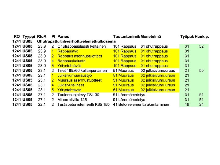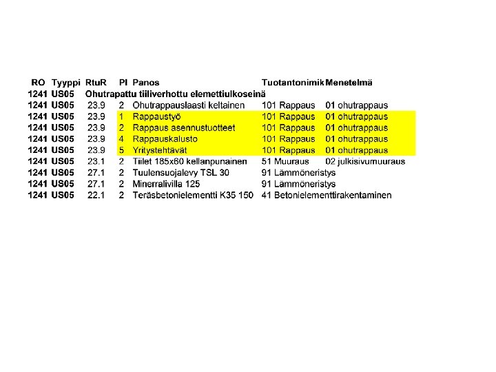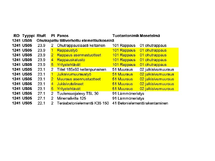 Tuotantonimikkeistö Hankinnat ja työt 1. 2. 3. 4. 5. 6. 7. 8. 9. 10. 11. Purkaminen ja säilyttäminen Maarakentaminen Aluerakentaminen Betonirunkor. , betonielementtir. , erikoisbetonir. , pinrabetonointi Kivirakentaminen Metallirakentaminen Puu ja levyrakentaminen Puurunkor. , puuelementtir. , puuvalmisosar. , levyr. , puupintar. Lasirakentaminen Eristäminen Pintarakentaminen Varustaminen HUOM: Rakennustuotteet, asennustyö, asennusaputyö, erityiskalusto, yrityspalvelut