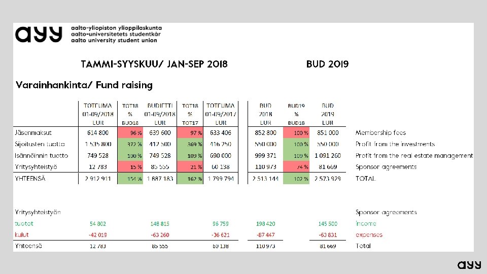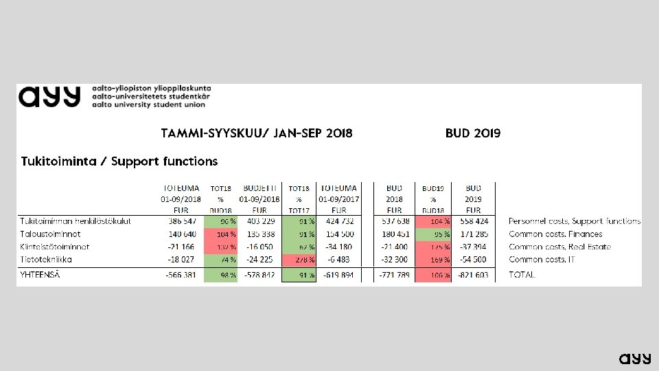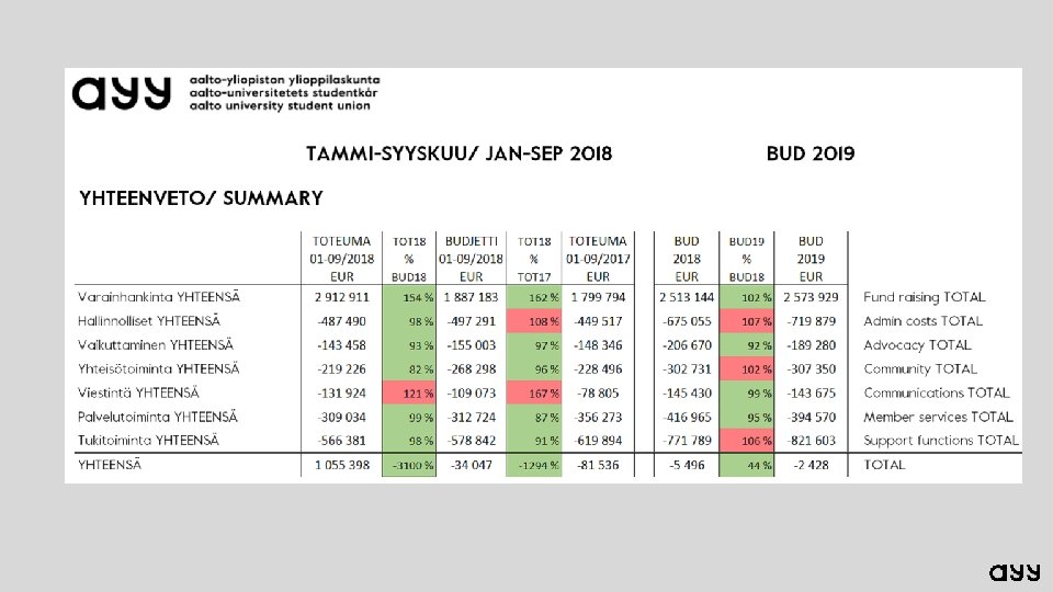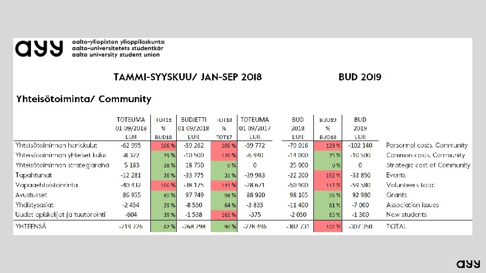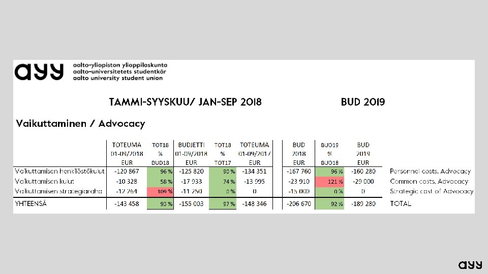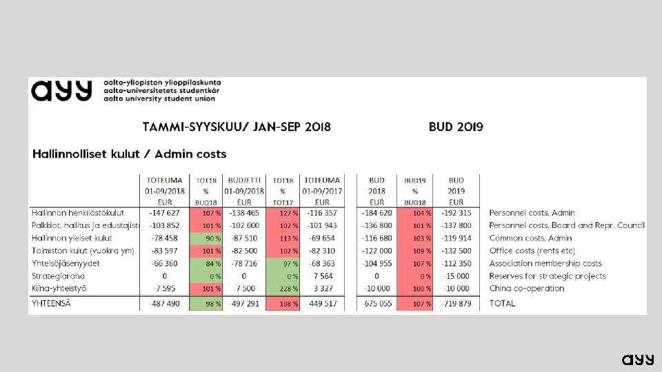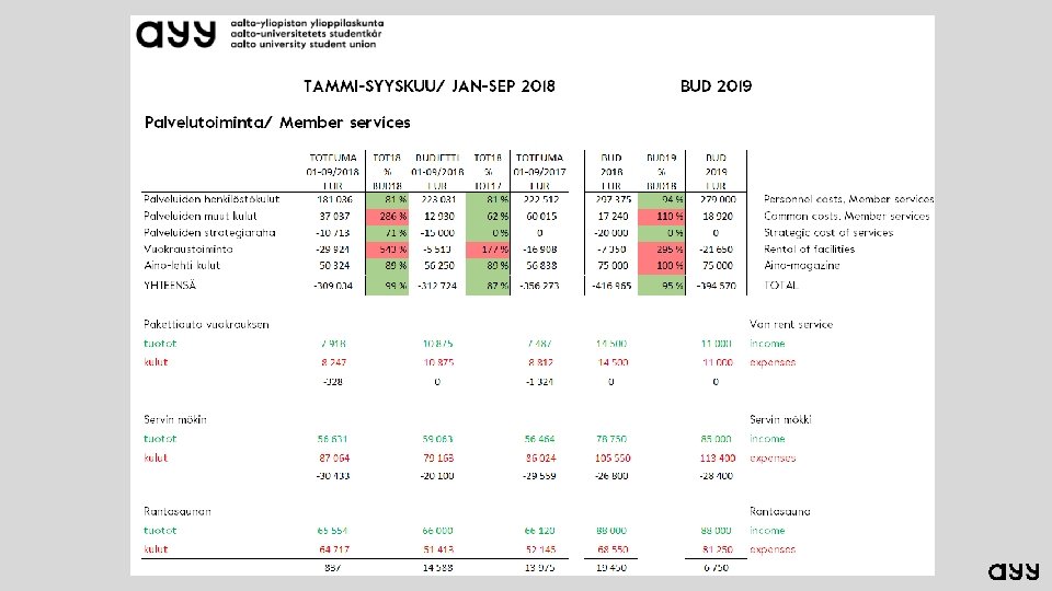 Strategiarahat • Strategiarahoja oli budjetoitu vuodelle 2018 yhteensä 60 t€ • Ytd 30. 9. tilanne on seuraava: • Yhteisötoiminnan strategiaraha T 7, 8 t€/B 25 t€, projektityö, nettisivut • Vaikuttamisen strategiaraha T 10, 5 t€/ B 15 t€, toimeentulokysely, nettisivut, projektityö • Palveluiden strategiaraha T 10, 7 t€/ B 20 t€, palvelukysely, nettisivut • Budjetti 2019: Strategiaraha (myös kestävään kehitykseen) 15 t€