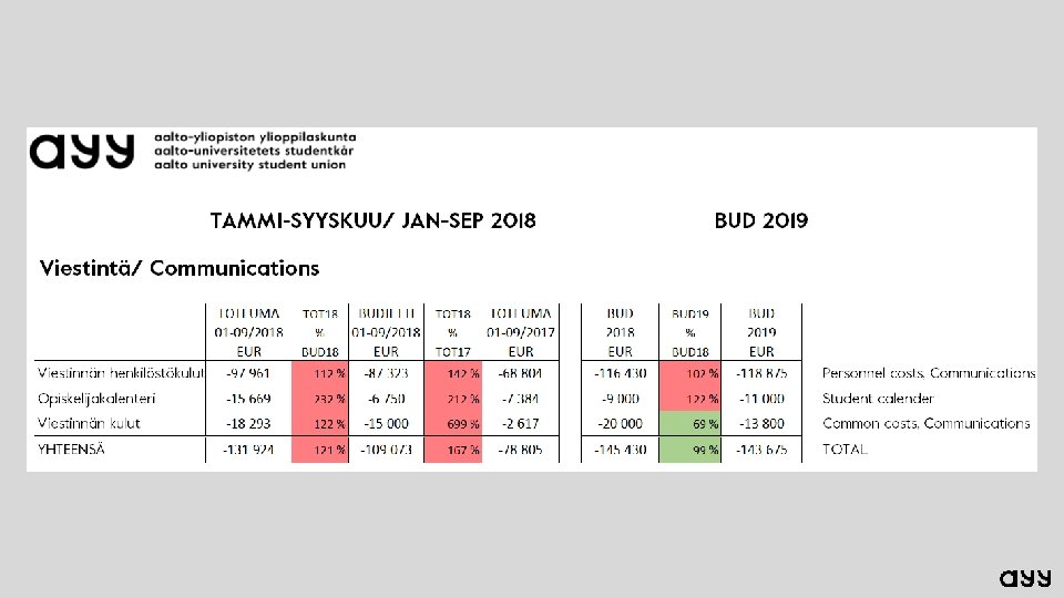 Budjetit Espoon kohteet • Tällä hetkellä Espoon kohteiden osalta nykyinen vuokra on keskimäärin 12, 69€/m 2/kk ja ARA: n budjetoituihin kuluihin perustuva keskimääräinen suositusvuokra 12, 03€/m 2/kk. • Otaniemen taloissa vaihtelua on kuitenkin runsaasti. OK 18 ja OK 20 taloissa on eniten korotuspaineita • Kohteet, joihin esitämme vuokrien korotusta ovat: • Servinkuja 1, 0, 7€ korotus • Korotukset perustuvat Servinkujalla budjetoituihin korkeisiin remonttikuluihin